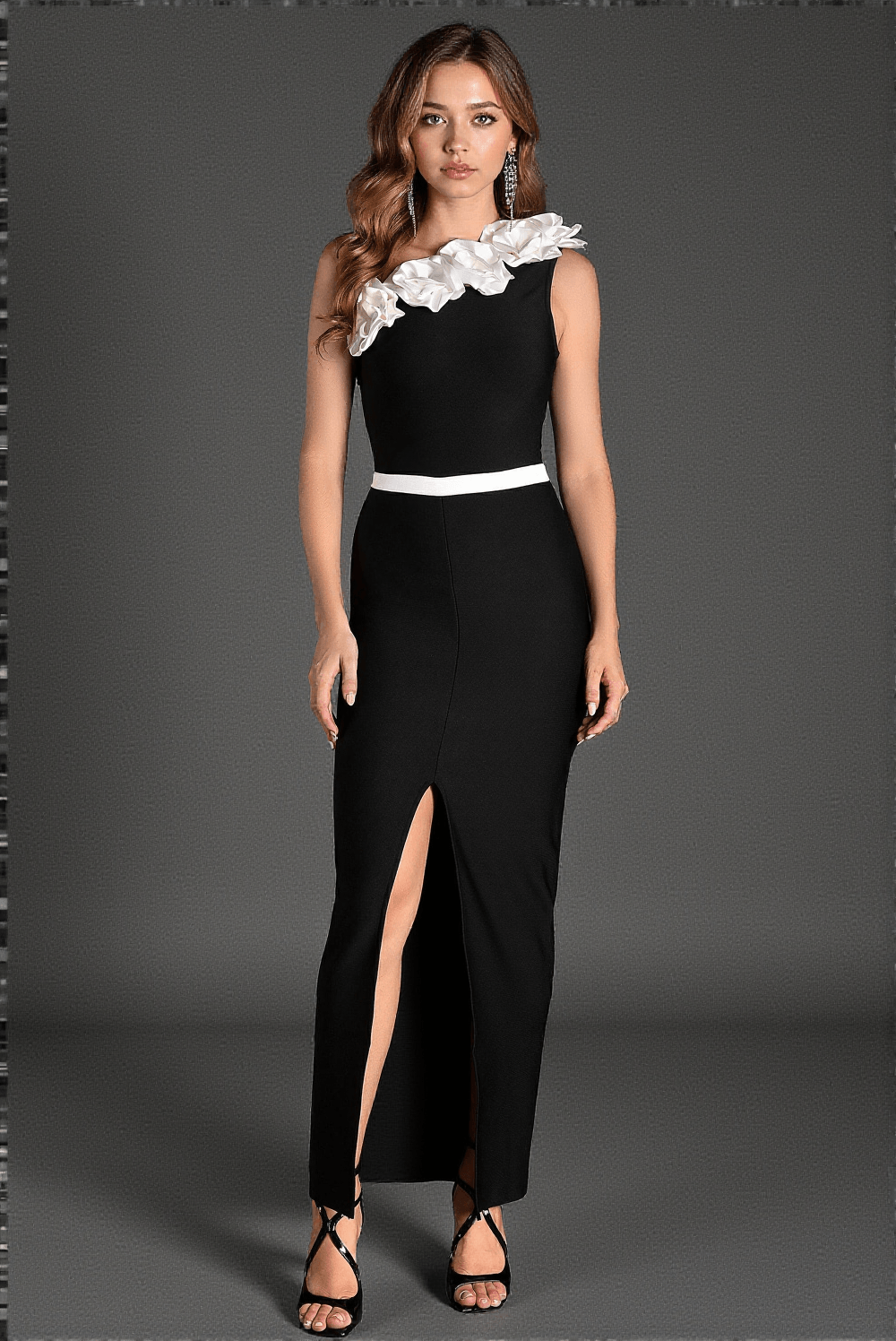 • Elegant white ruffled floral embellishments are strategically placed to highlight the beauty of this dress, making it stand out at any formal event or gala.