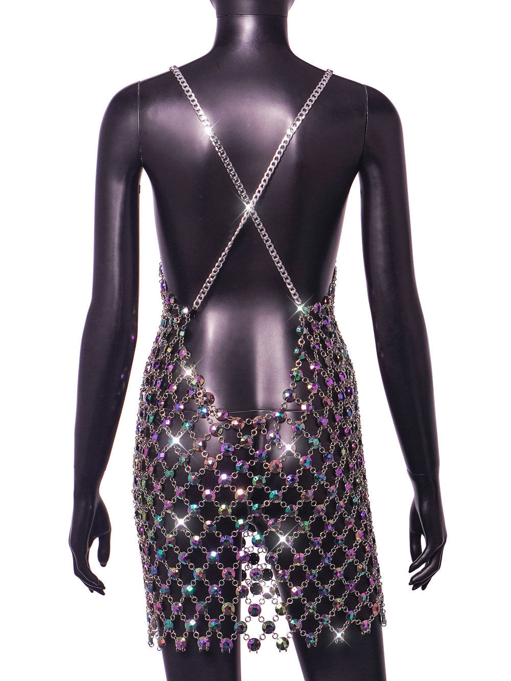 Look and feel glamorous in this Rhinestone Hollow Body Chain Dress! Stand out at your next special occasion with a dress that features bold rhinestones, a hollow body chain design, and an alluring silhouette. Shine and make a statement in this dazzling piece!