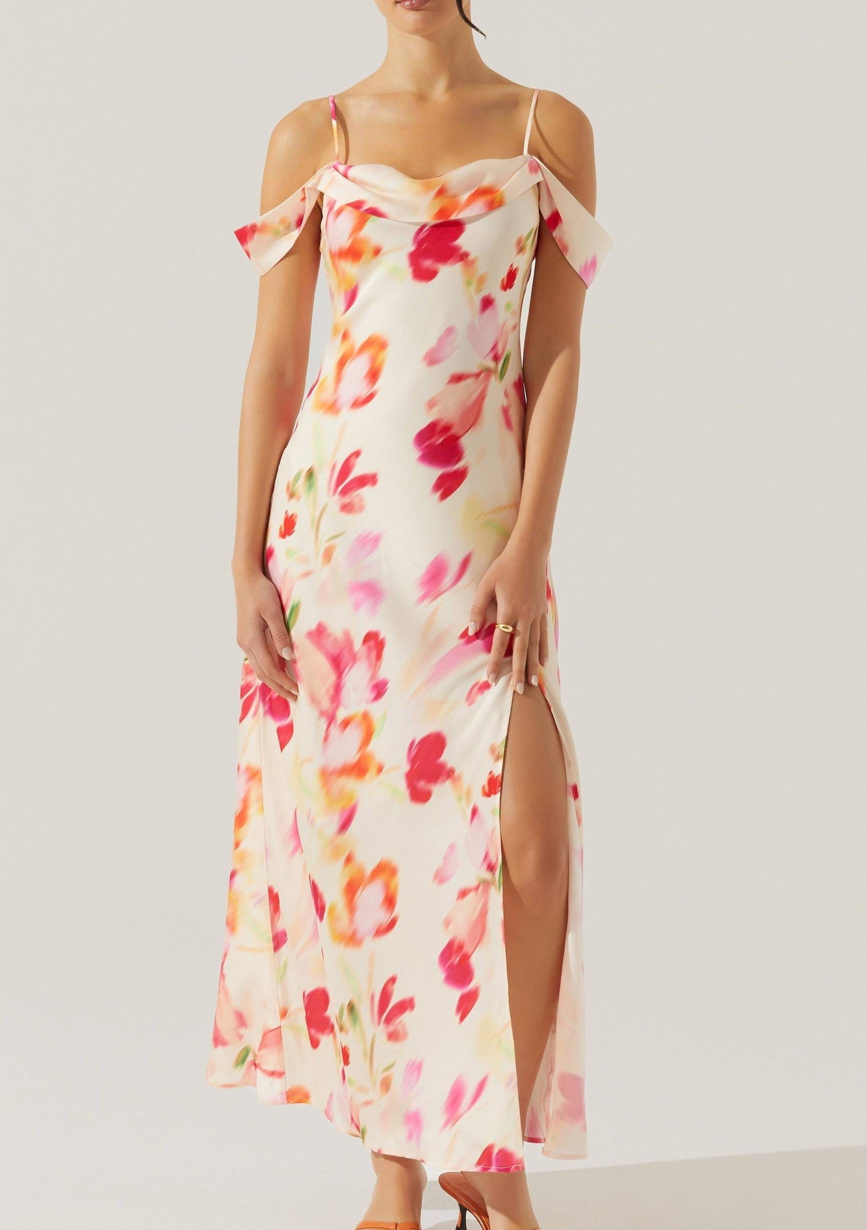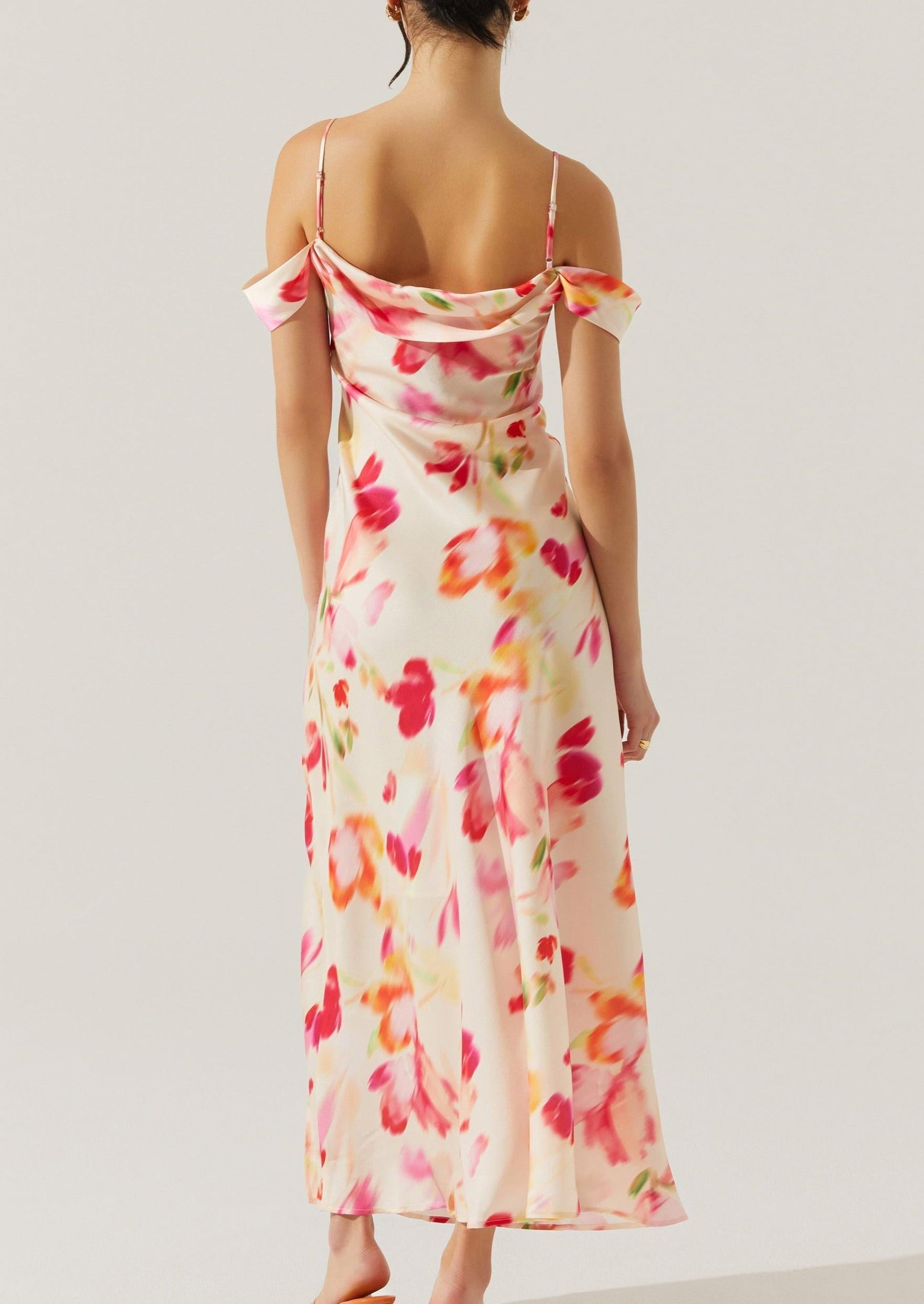 satin slit cold shoulder maxi dress in pink watercolor