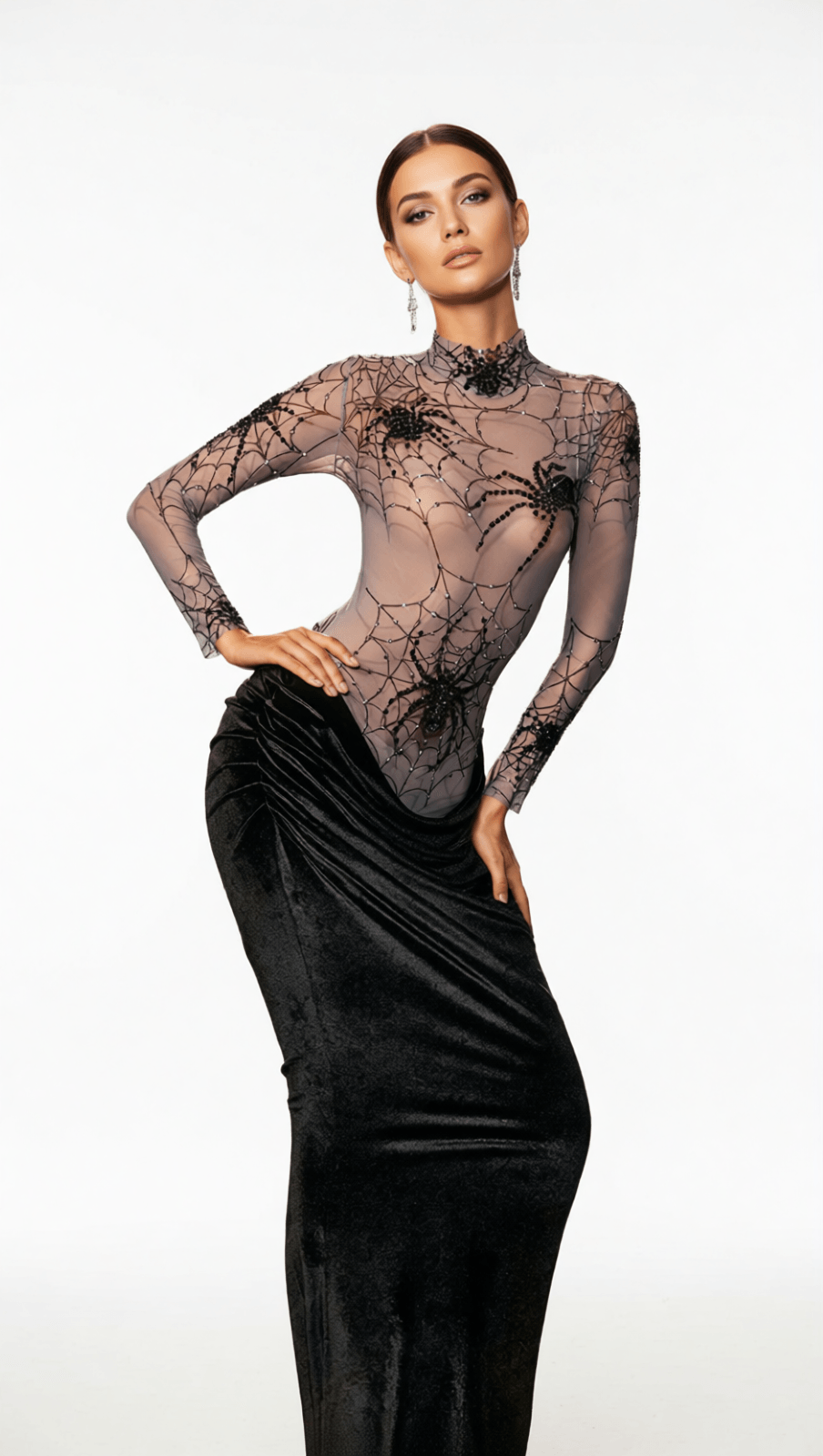 What truly sets this dress apart is its mesmerizing bodice, featuring intricate, shimmering spider web patterns adorned with bold, sparkling spiders. This daring, sheer long-sleeve design creates a striking, elegant silhouette, while the plush velvet maxi skirt drapes dramatically, ensuring you make a memorable entrance. Perfect for Halloween galas, sophisticated evening parties, or any special occasion, the Kjartan dress blends luxury with a truly unique style, empowering you to stand out with undeniable confidence.