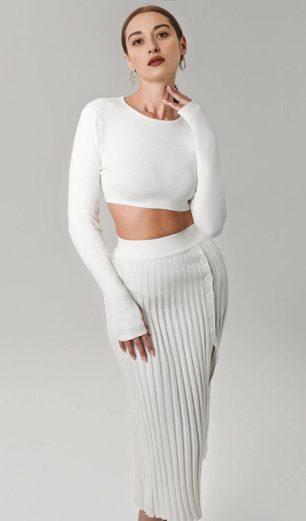 Introducing our White Knit Set, a perfect addition to your winter wardrobe. Made from soft viscose, this set features a knitted top and a pleated skirt with a stylish slit at the hip. The buttons on the skirt allow you to adjust its height, giving you the flexibility to create different looks.