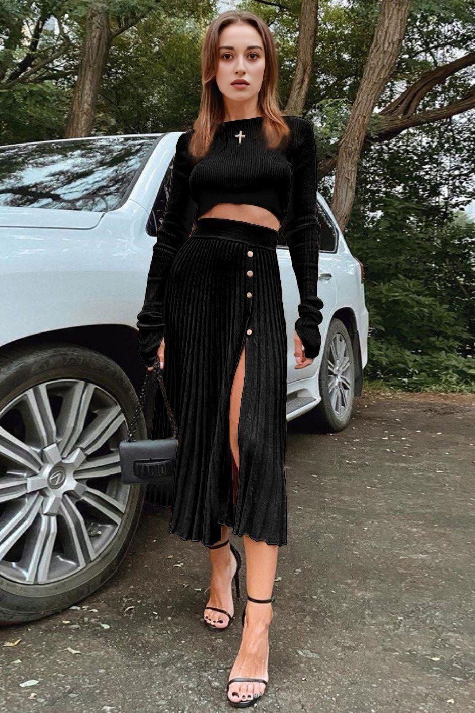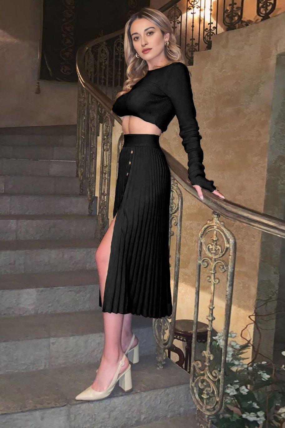 • Stylish Design: The pleated skirt with a slit adds a touch of elegance to the set, making it perfect for both casual and formal occasions.