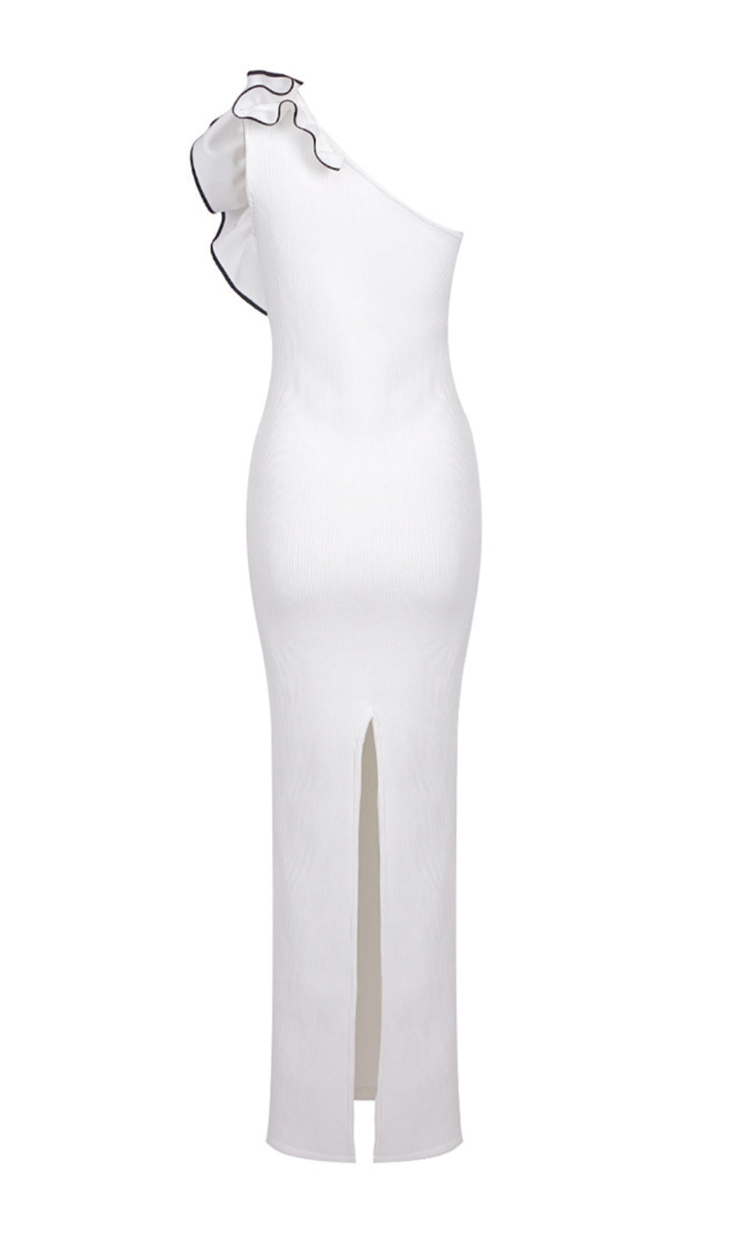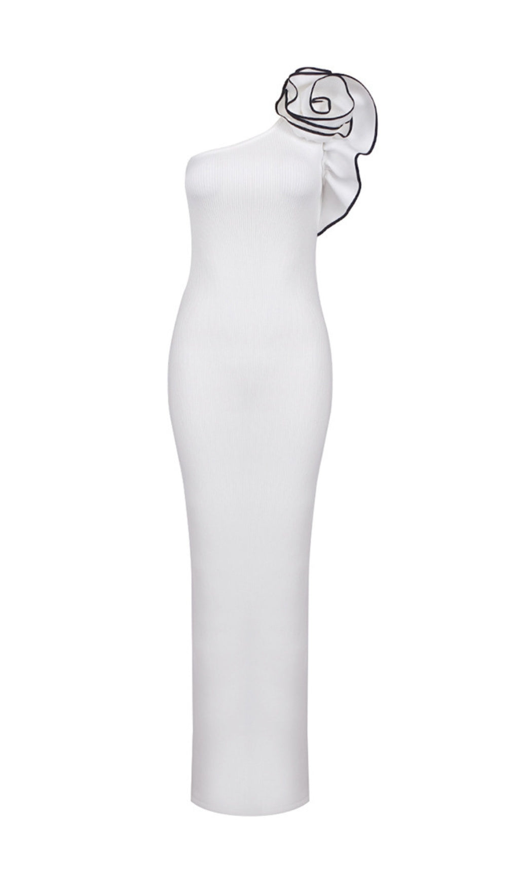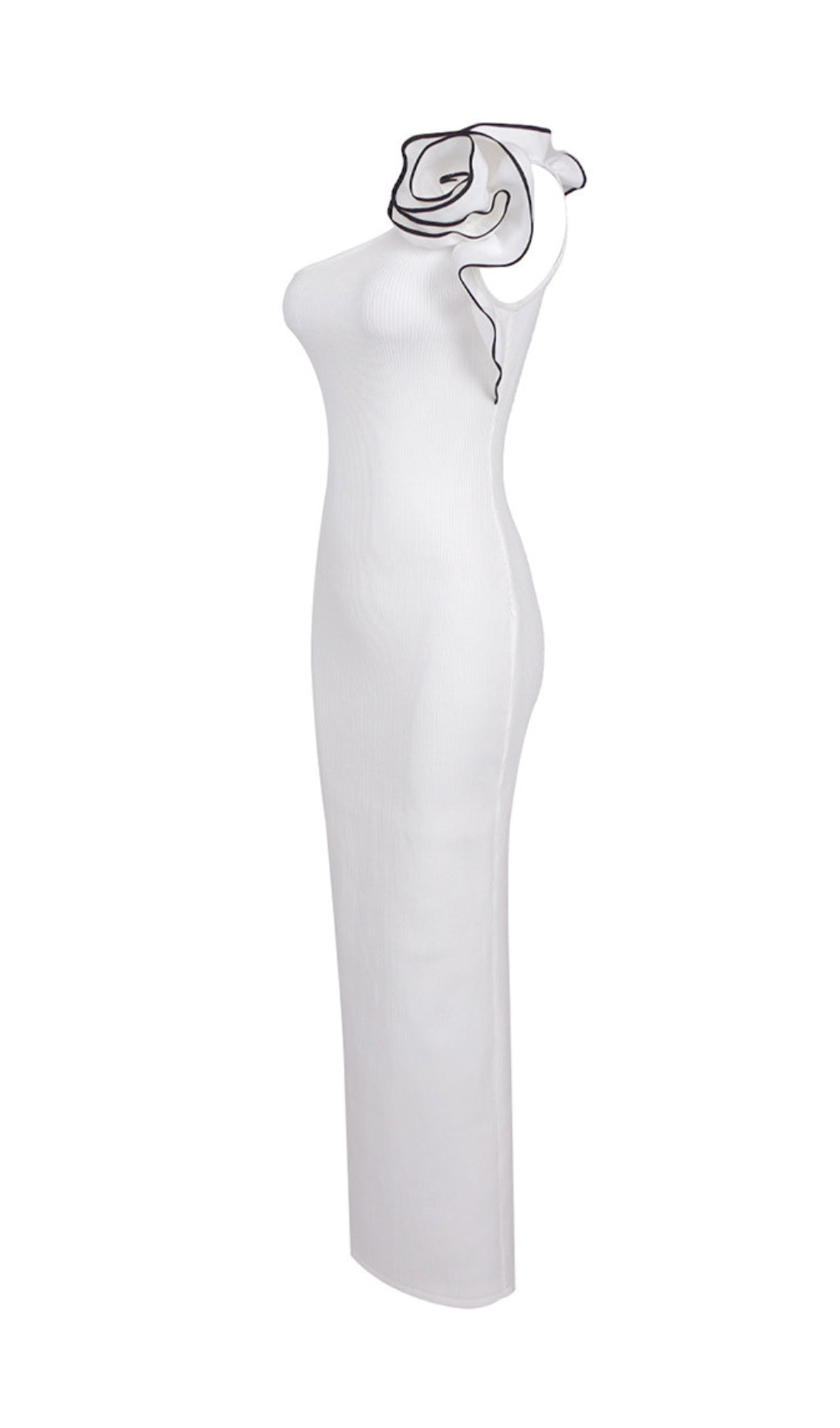 - Knitted, asymmetrical, fitted, long dress with a slit at the back and decor in shape of a big flower.