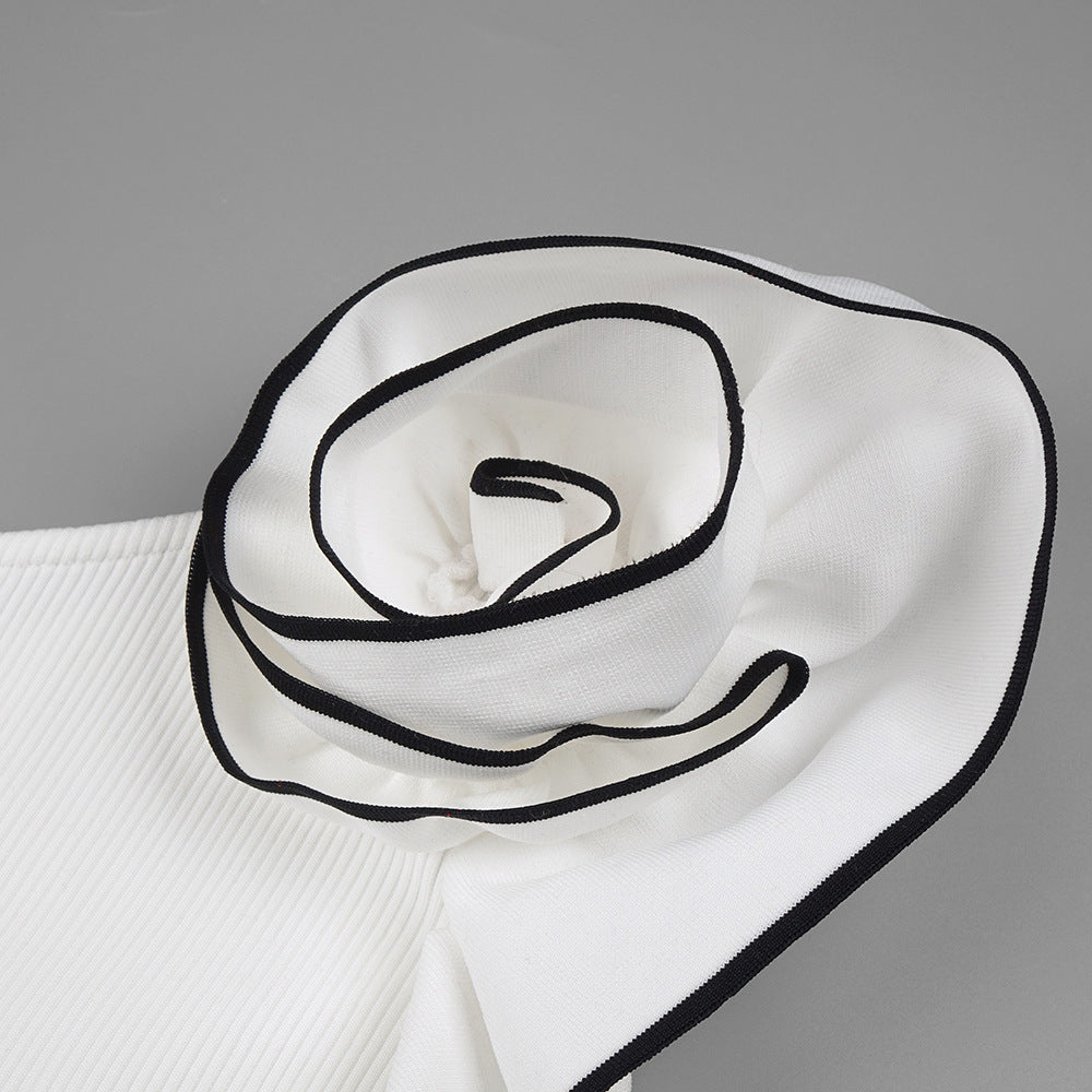Experience effortless elegance in our dress. Crafted from high-quality knit fabric, this dress boasts a unique asymmetrical design and delicate flower details. Perfect for any occasion, it offers comfort and style in equal measure.