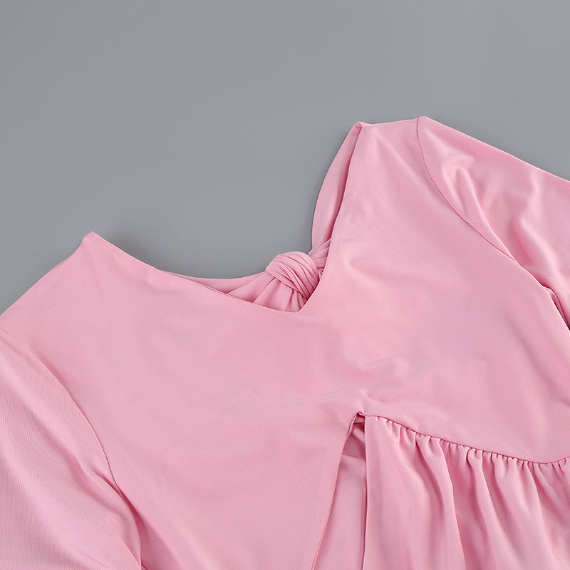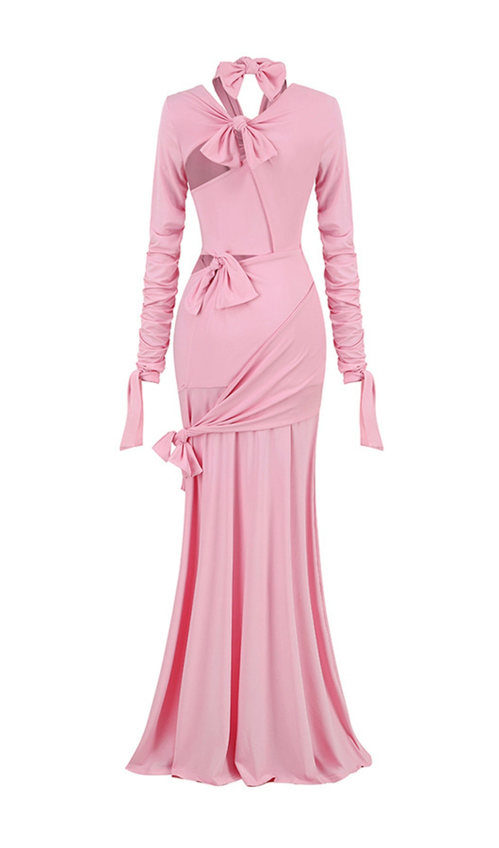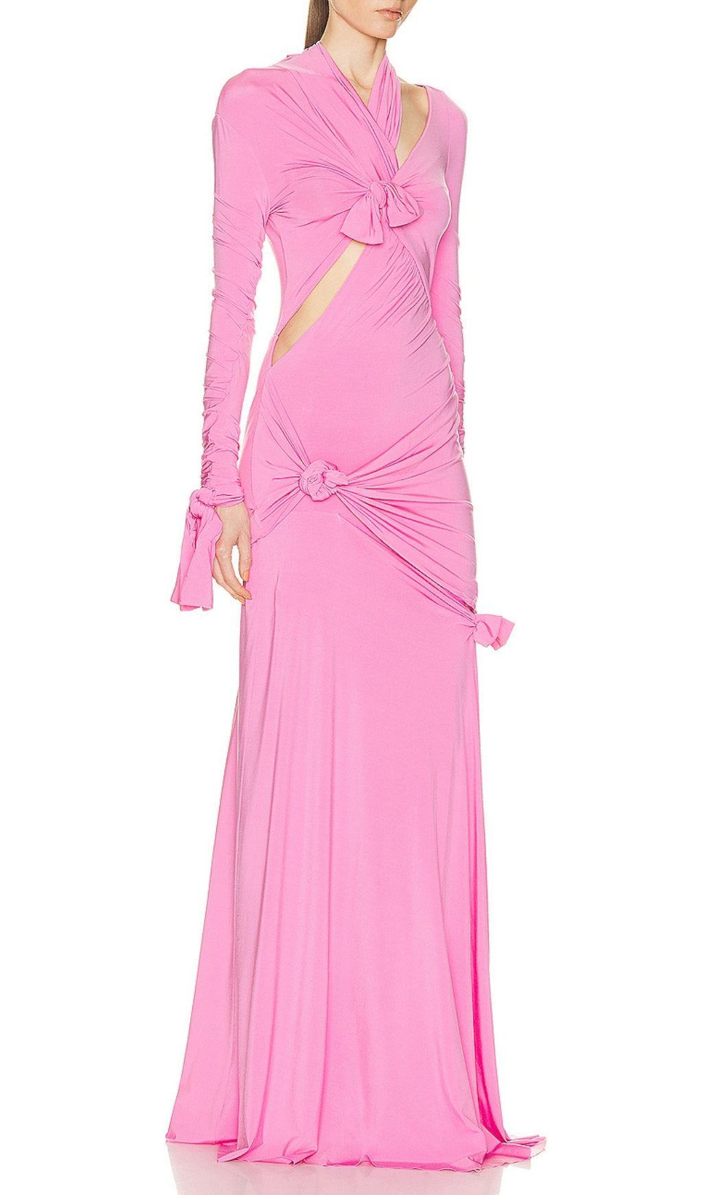 This charming "Knotted Slits Gown in Pink" features a ravishingly intricately-designed fabric, knotted cutout with maxi slits, and a graceful pink color that will create a beautiful silhouette. Perfect for a special occasion or evening, this exquisite gown will have you looking your best.