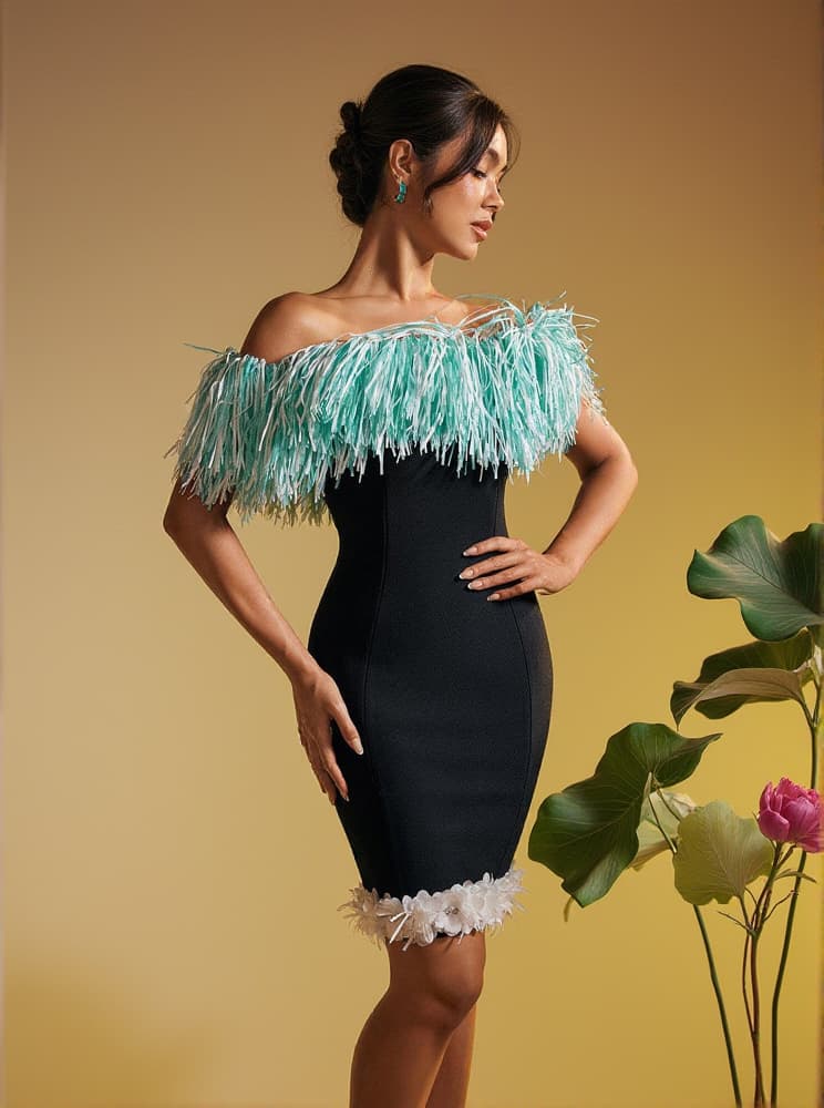 Get ready to turn heads in the Koda Strapless Fringe Flower Bandage Mini Dress! This stunning dress features a strapless design and eye-catching fringe and flower detailing. Perfect for any special occasion, it will make you feel confident and stylish. Stand out from the crowd and make a statement in this must-have dress!