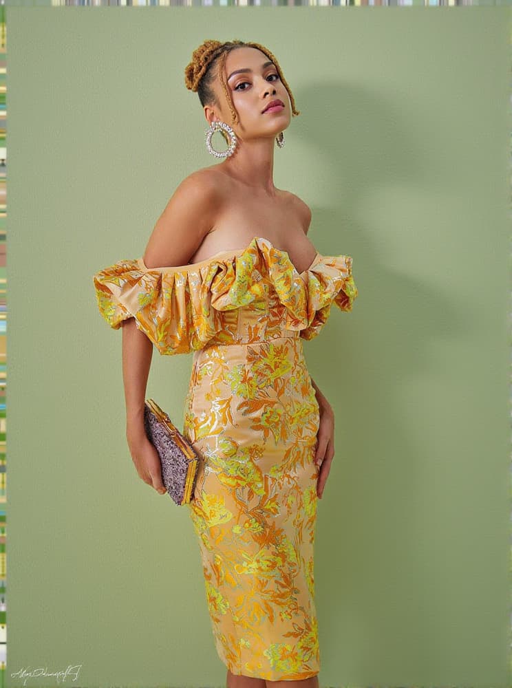 Kore Off Shoulder Jacquard Midi Dress is a sophisticated style featuring a flattering off shoulder neckline and midi length skirt made from luxurious jacquard fabric. Its stylish fit and drape offer an elegant and demure look for any occasion.