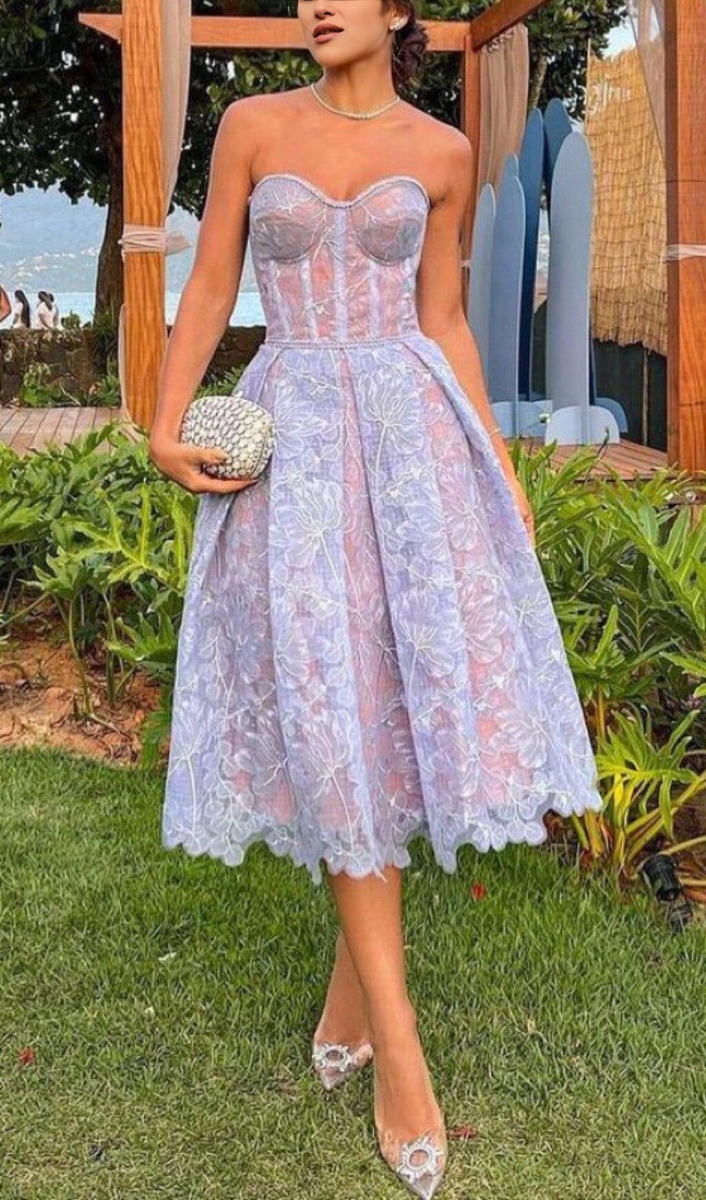 Indulge in the sheer beauty of our Lace Bandeau Midi Dress in Blue. This dress is designed to make you feel like the most alluring person in the room. The three-dimensional floral pattern lace adds an exquisite touch, making this dress truly outstanding.