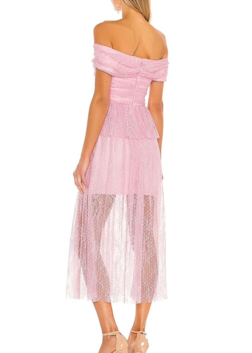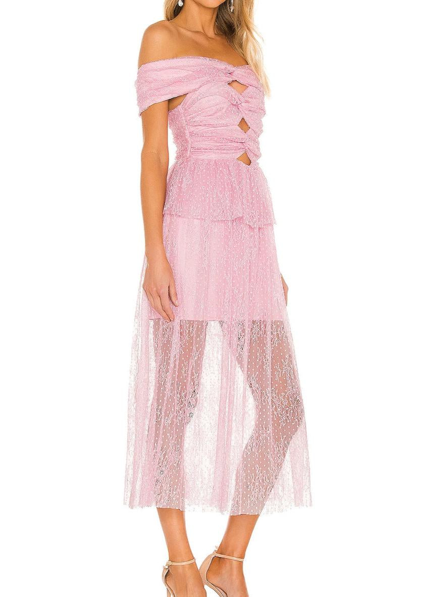 This lilac strapless midi dress features delicate lace detailing and elegant cutouts, combining sophistication with a modern edge. Its flattering silhouette enhances your figure while the soft fabric ensures comfort throughout wear. Perfect for special occasions, this dress offers a refined yet contemporary look.