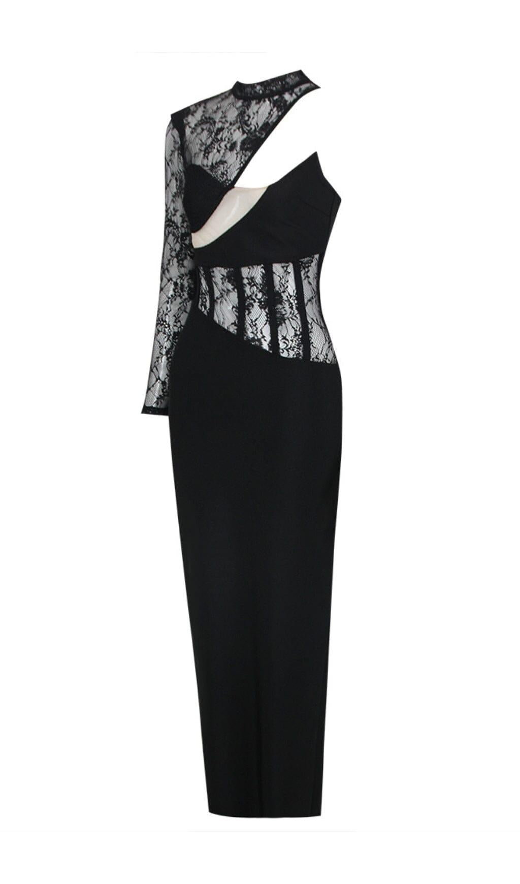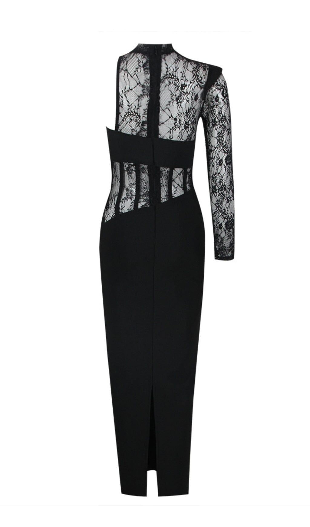 LACE ONE SHOULDER MIDI DRESS IN BLACK