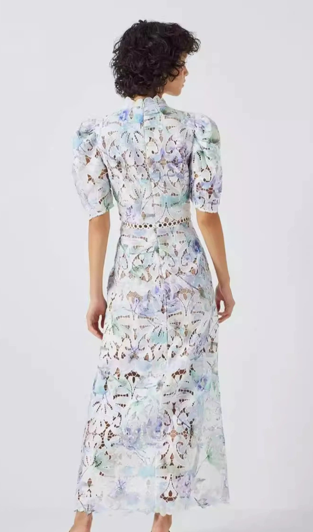 LACE PUFF SLEEVE STAND COLLAR MIDI DRESS IN WHITE
