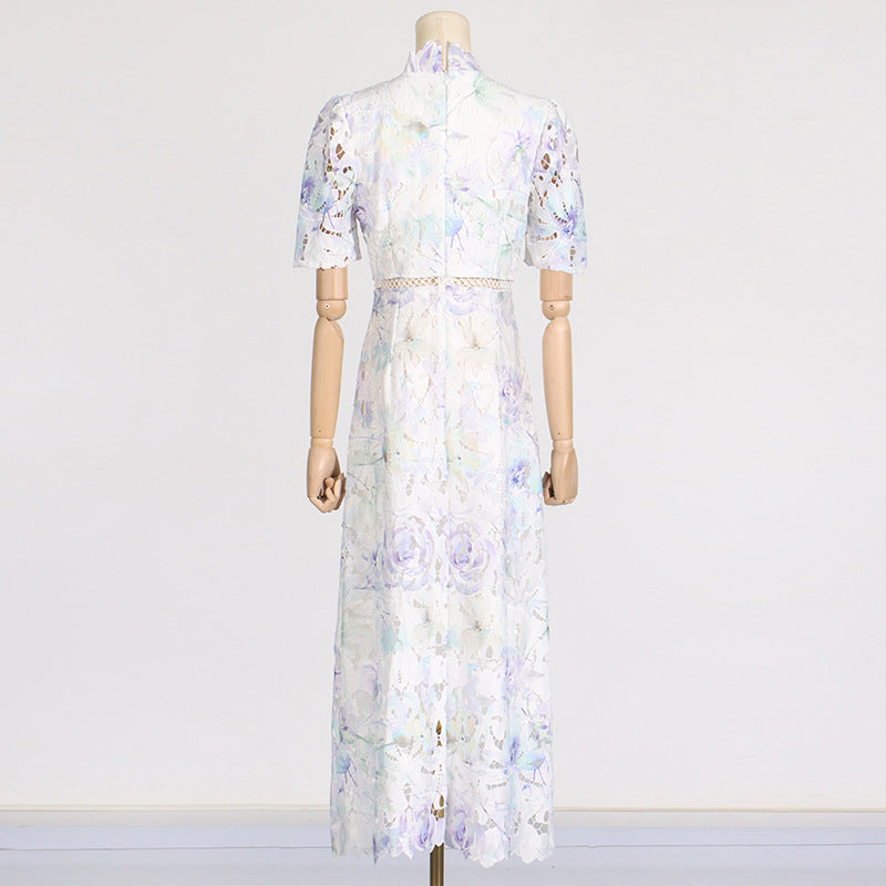 The delicate lace details and puff sleeves add a touch of elegance, while the stand collar creates a sophisticated look. Perfect for any special occasion or a night out, this dress will make you feel confident and beautiful.