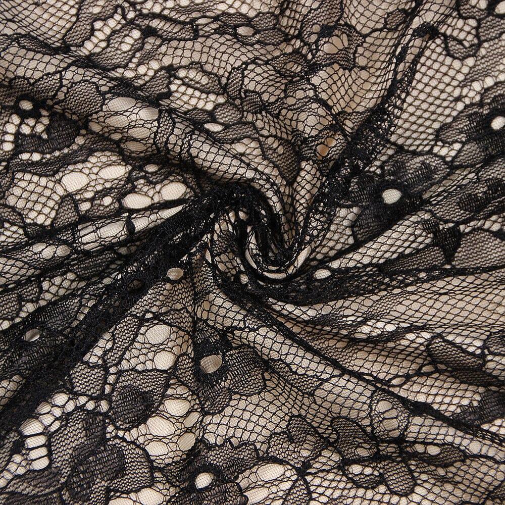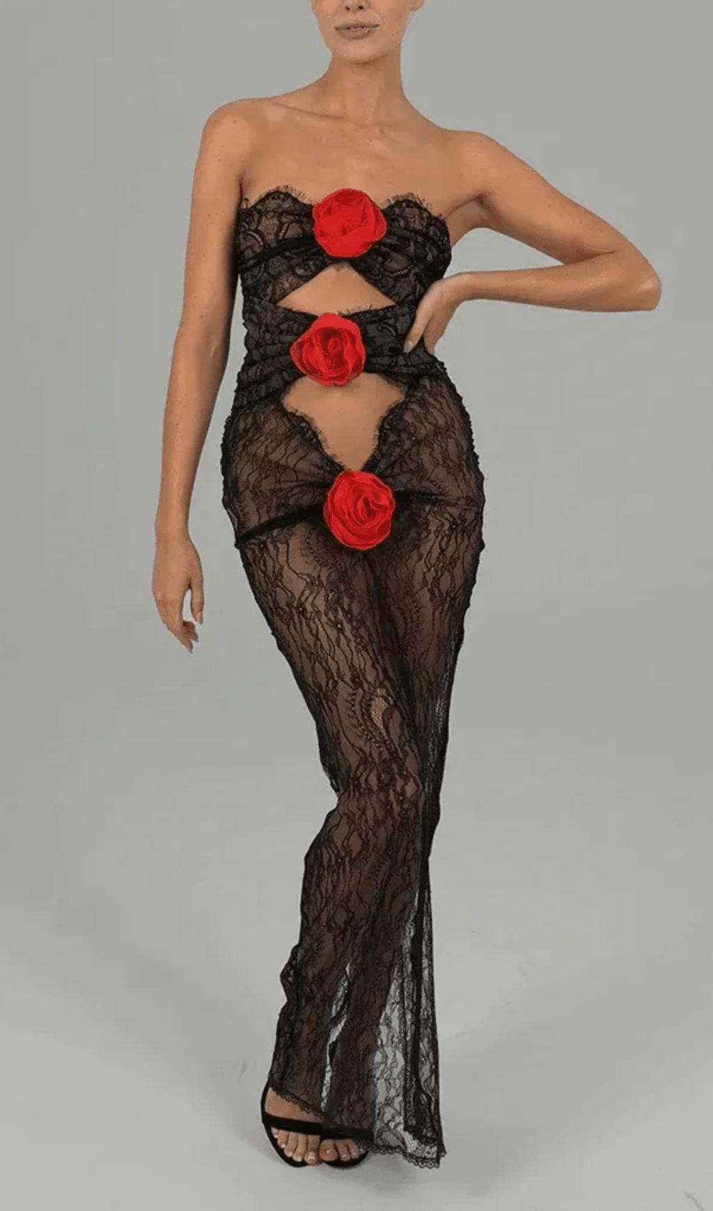 Long lace dress decorated with red roses.
