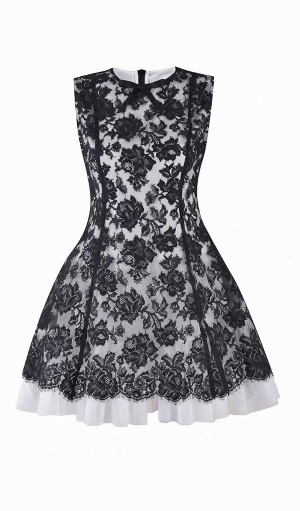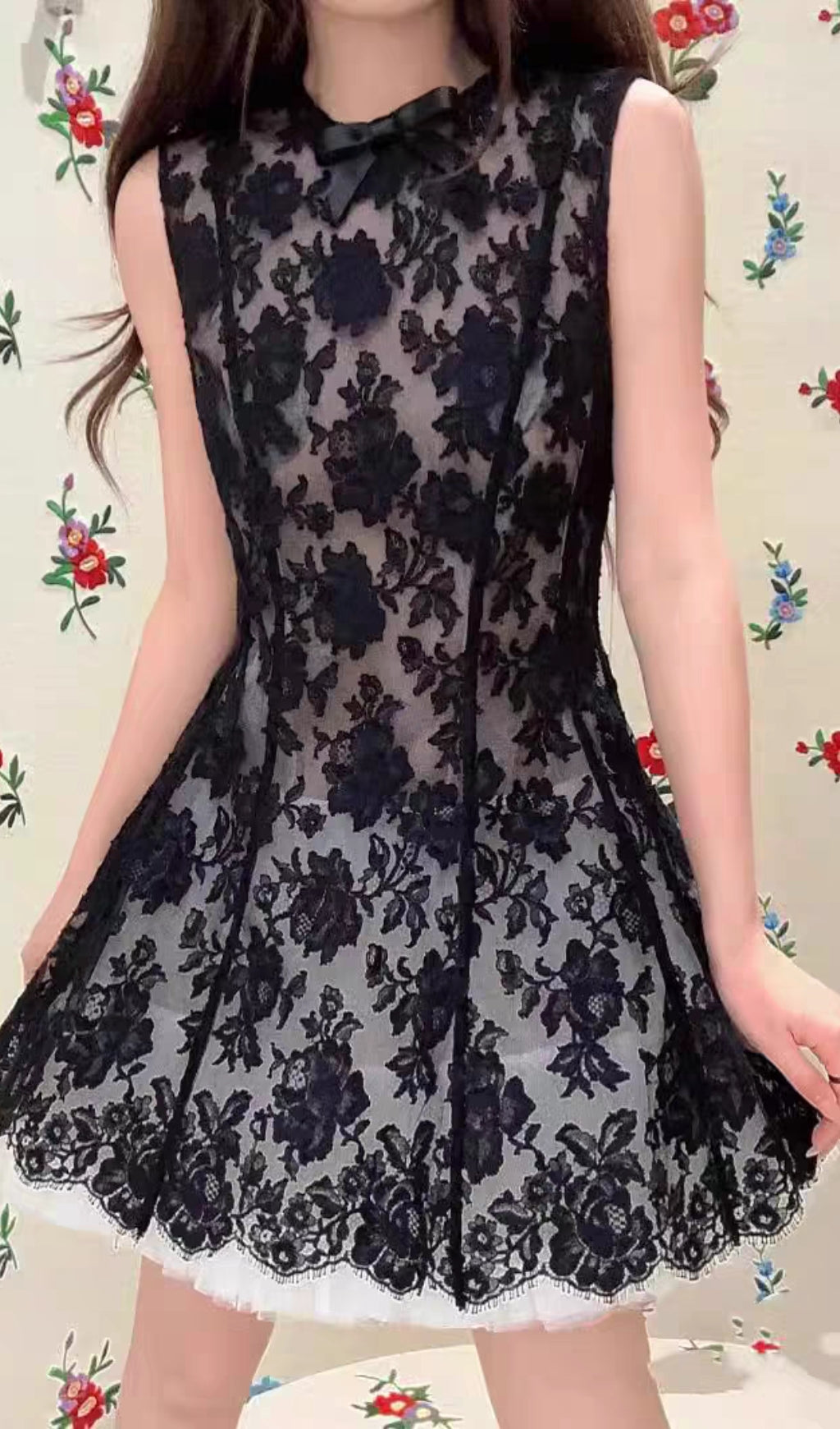 Looking for a chic and stylish dress? Look no further than our black lace sleeveless mini dress! This dress features delicate lace detailing and a black bow tie for a touch of elegance. Perfect for any occasion, this dress will have you looking and feeling your best.