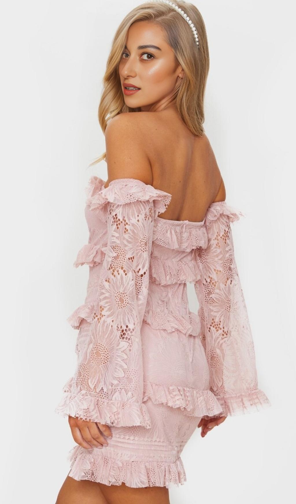 Introducing our Lace Tiered Frill Detail Bardot Bodycon Dress in Dusty Pink!