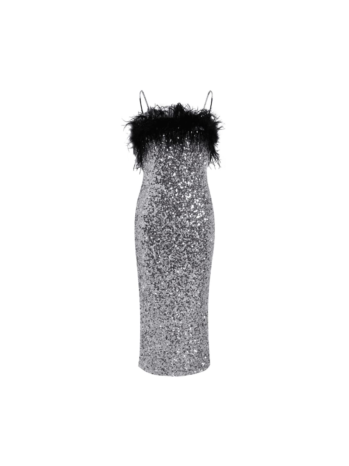 This Lambo Crystal Chain Feather Sequin Dress is sure to make a statement. Featuring a crystal chain, feather, and sequin details, it is the perfect choice for any special occasion. This high-quality, trendy piece is sure to be a conversation starter.