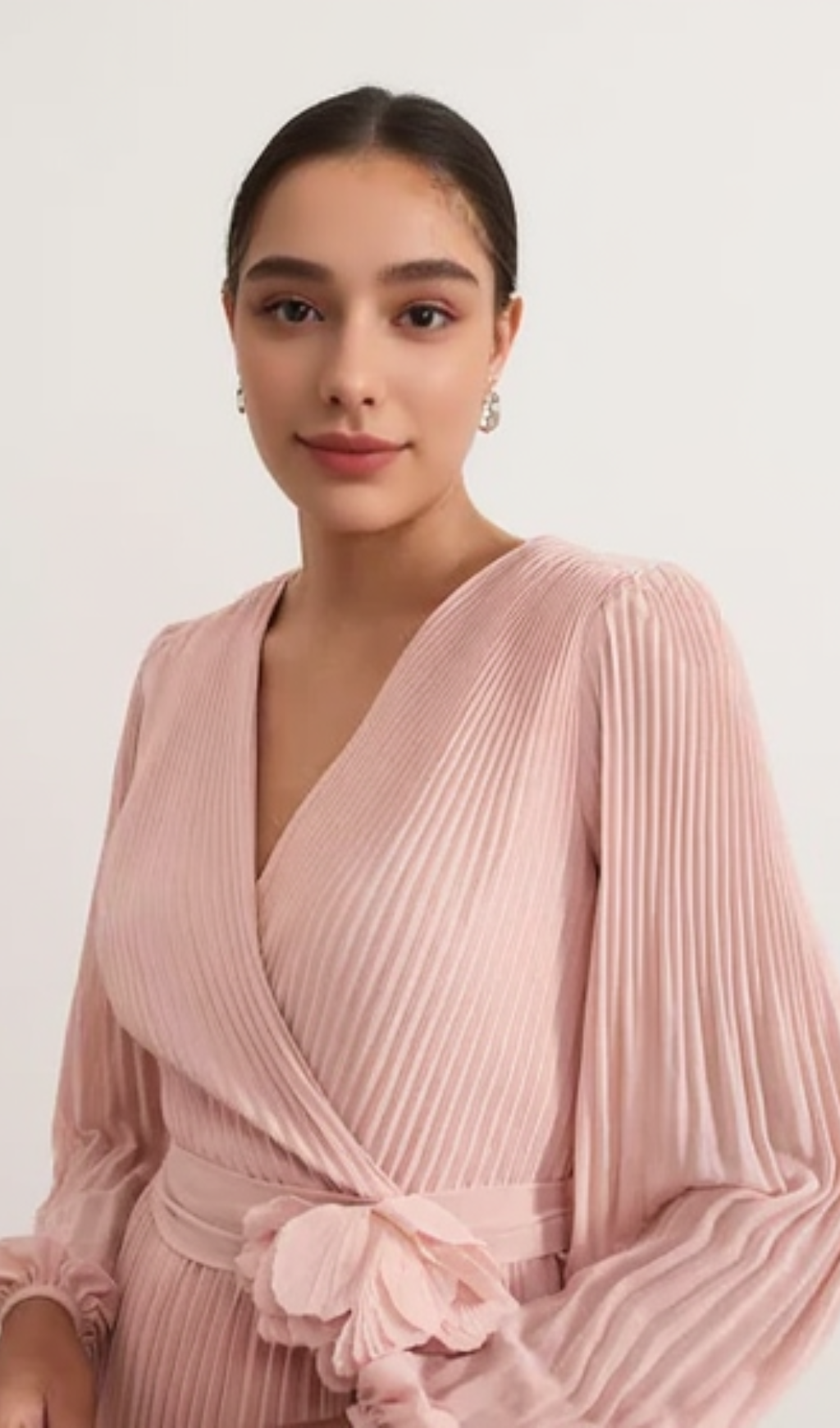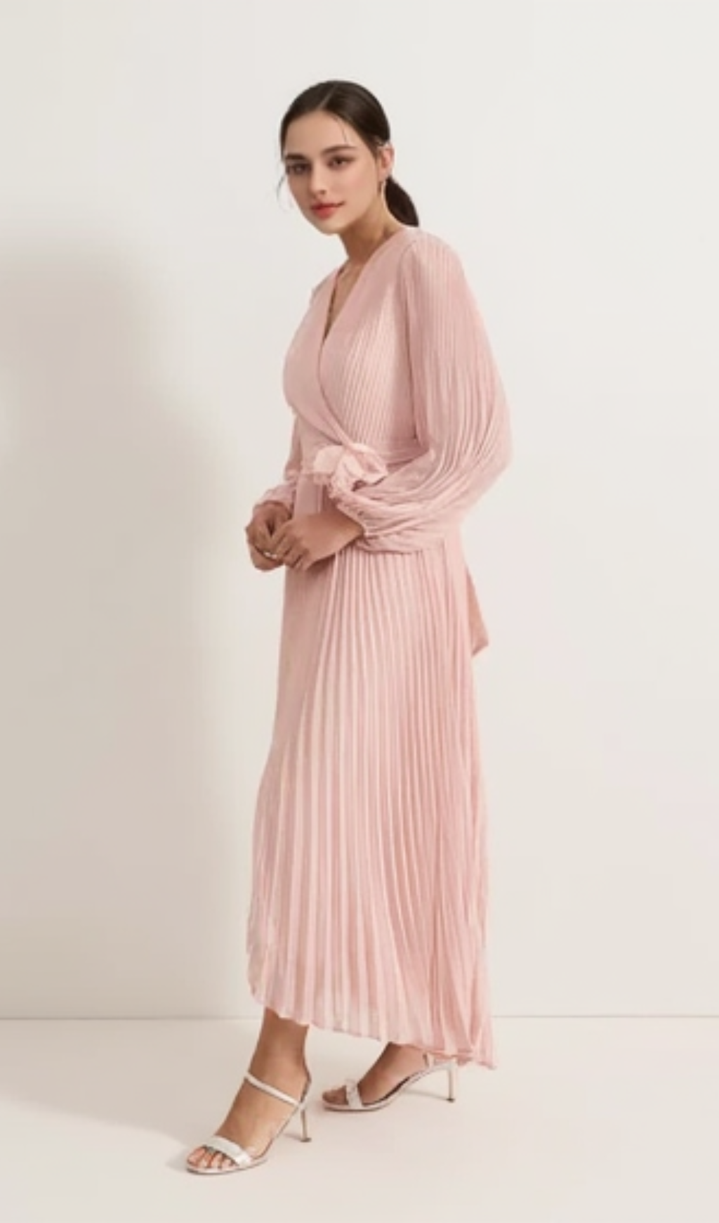 lantern sleeve pleated maxi dress in pale pink