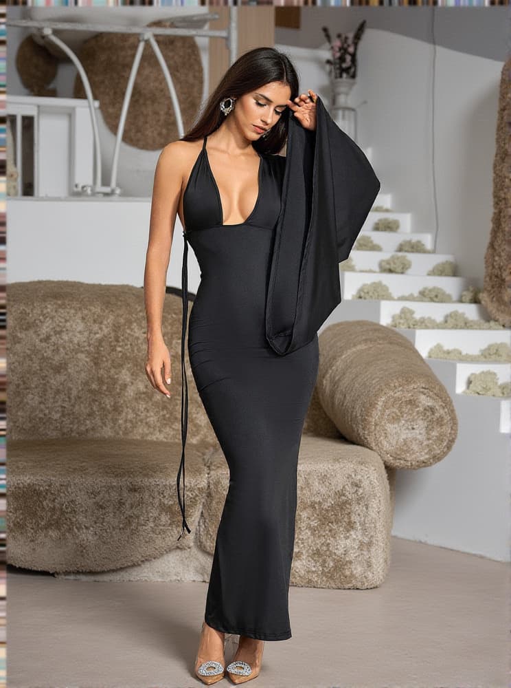 Be the epitome of elegance in this Lasma Backless Kimono Sleeve Maxi Dress. Featuring a backless kimono sleeve design, this dress is perfect for any special event. It is made from a lightweight fabric that allows you to make a statement with your look while ensuring optimal comfort.