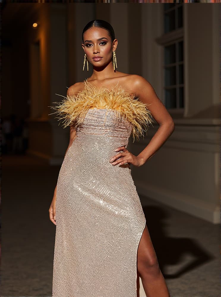 This Laurell Strapless Feather Sequin Maxi Dress is a stunning addition to any formal wardrobe. Expertly crafted with a strapless bodice, feather trim, and sequin details, it flows elegantly down to the floor with a striking split detail. Effortlessly glamourous, this dress is perfect for any special occasion.