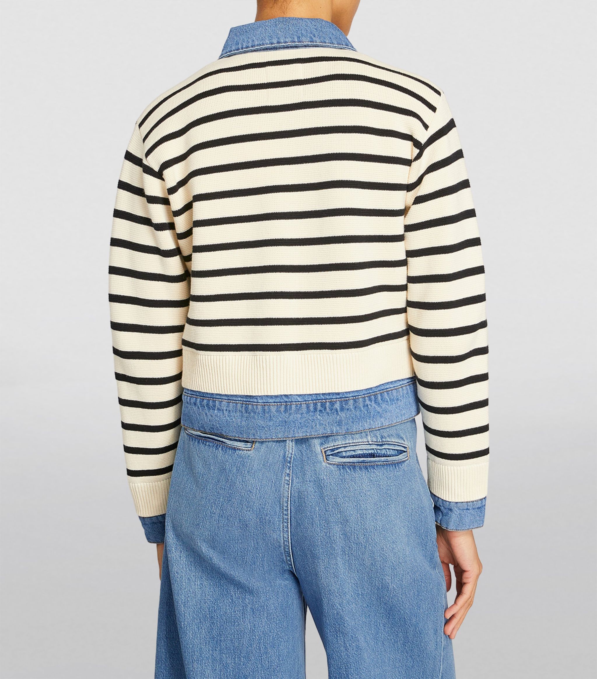 • Allover stripes, denim trim collar, placket, cuffs and hem