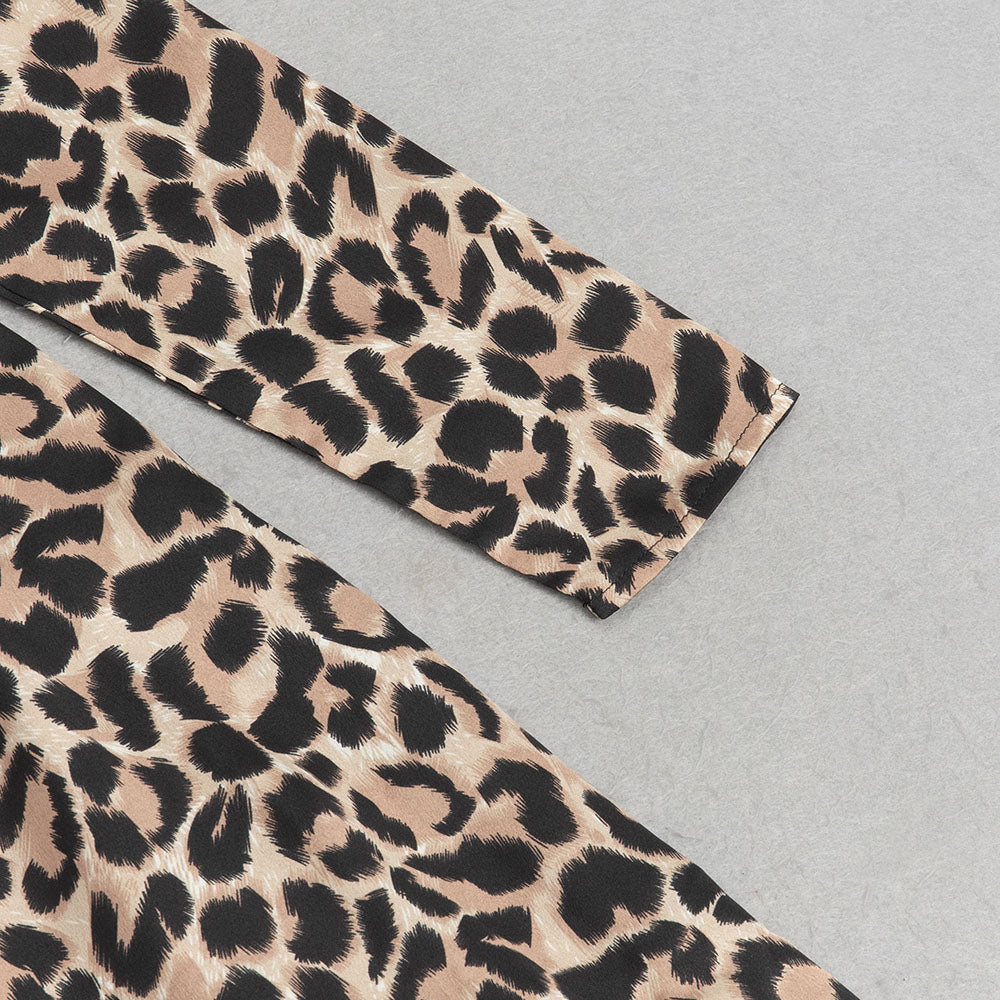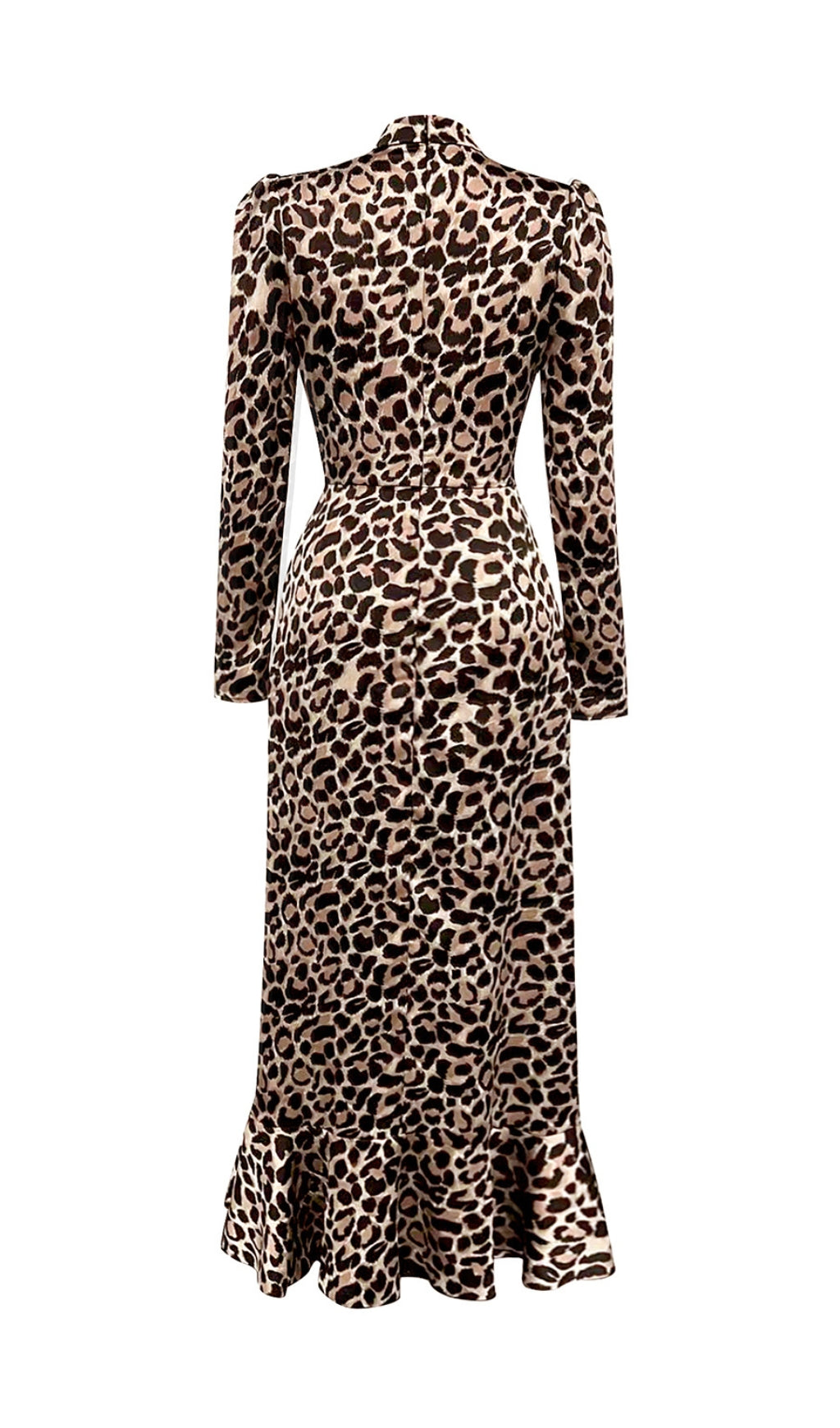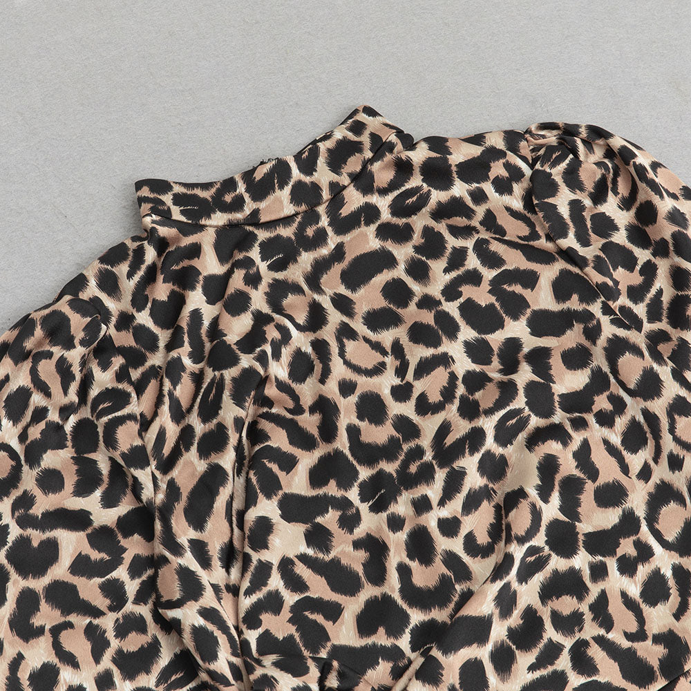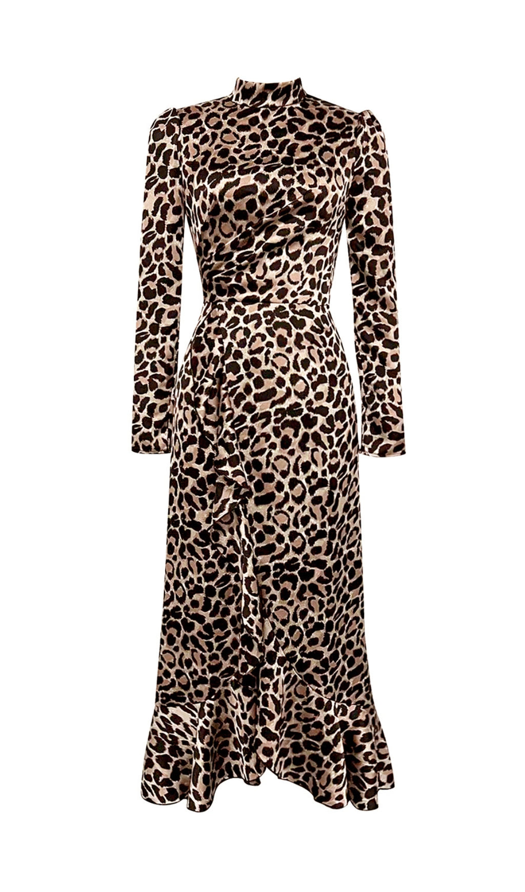 The bold leopard print and delicate ruffle trim add a touch of playful sophistication, while the mock neck and wrap hem create a flattering silhouette. Own the room in this must-have statement dress.