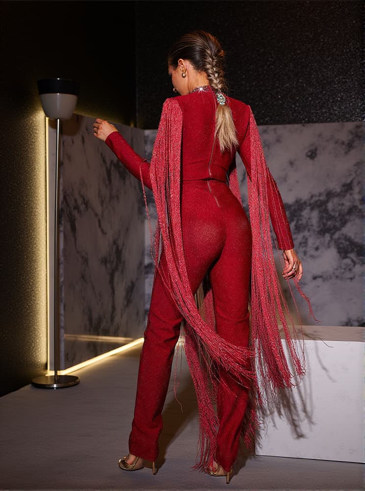Experience the ultimate fashion statement with our Lisanne Long Sleeve Fringe Bandage Jumpsuit. Stand out in this stylish and chic jumpsuit, perfect for any occasion. Flattering long sleeves and fringe detailing make this jumpsuit a must-have for your wardrobe. Step into the spotlight and feel confident and empowered in this stunning jumpsuit!