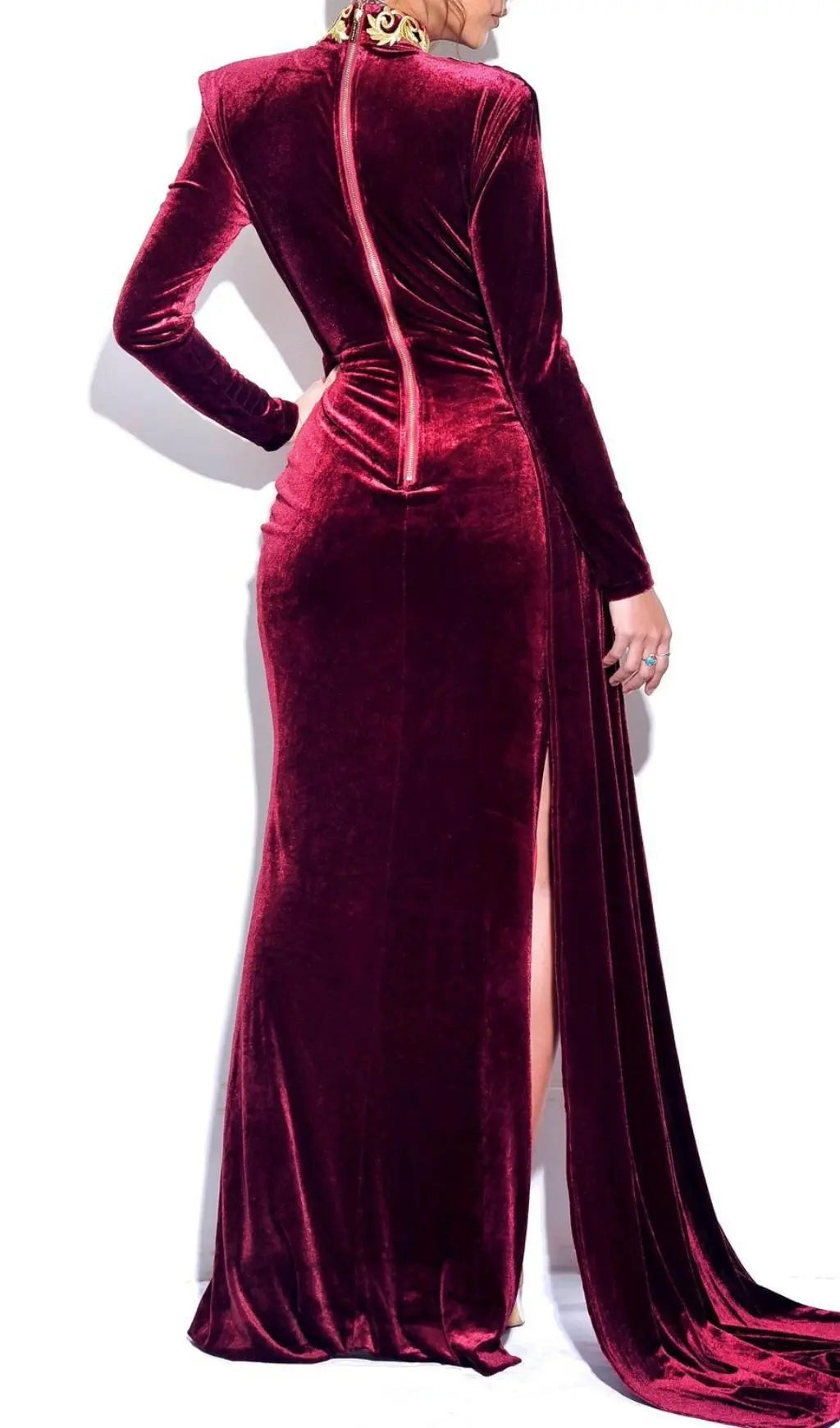 Celebrate the night in the red Velvet Cutout Maxi Dress! Whether it's for a wedding or treating yourself out, this dress will bring the luxe vibes with its smooth velvet fabrication that shapes long sleeves, a embroidery high neck, and a princess-seamed bodice. A figure-skimming silhouette ends at a mermaid maxi skirt with a flirty thigh-high side slit.