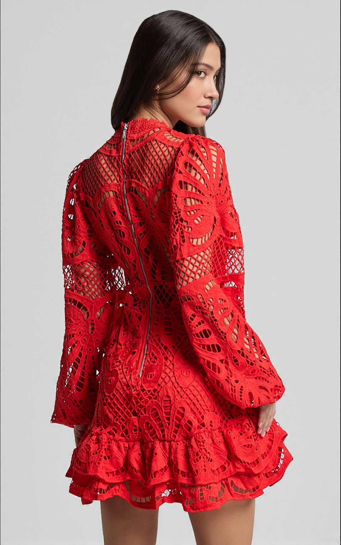 LONG PUFF SLEEVE LACE MINI DRESS IN RED
