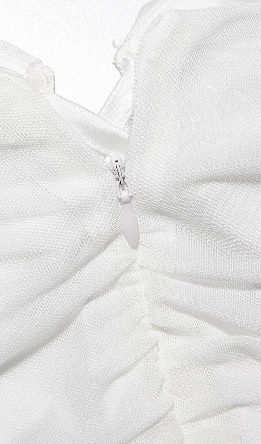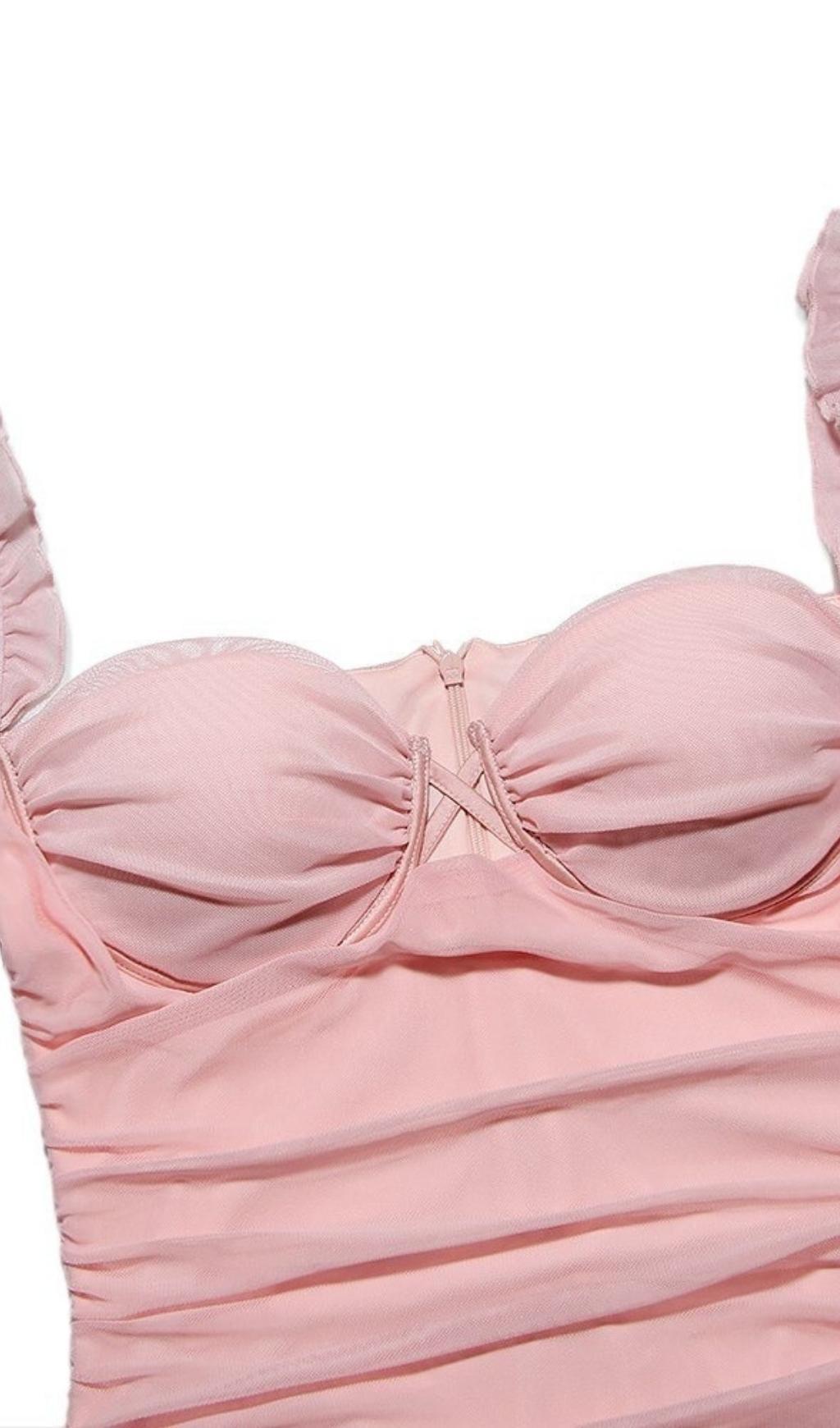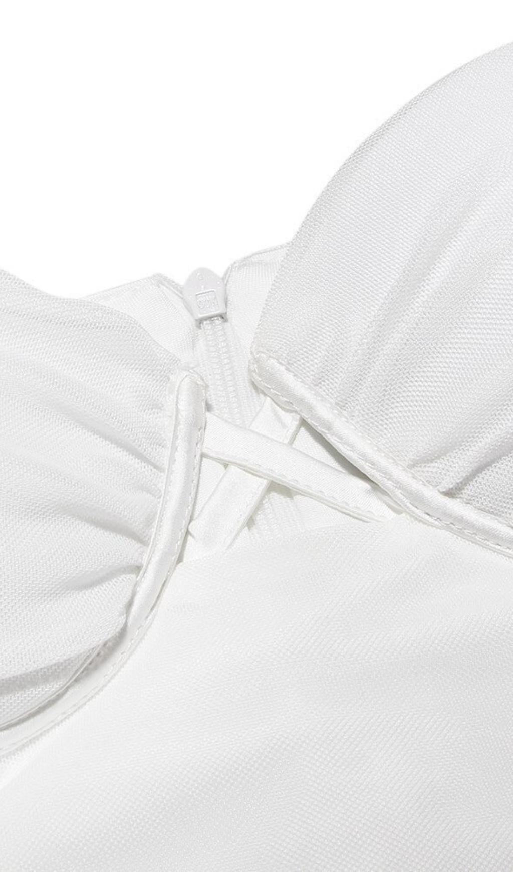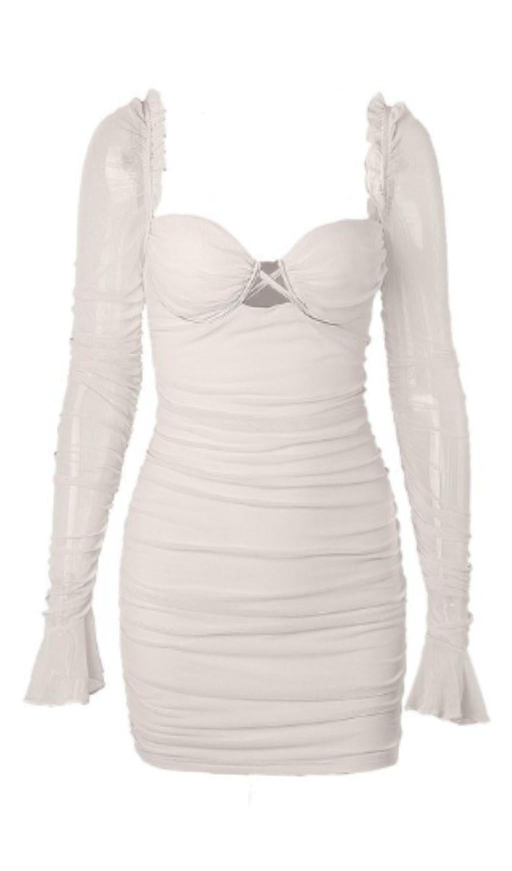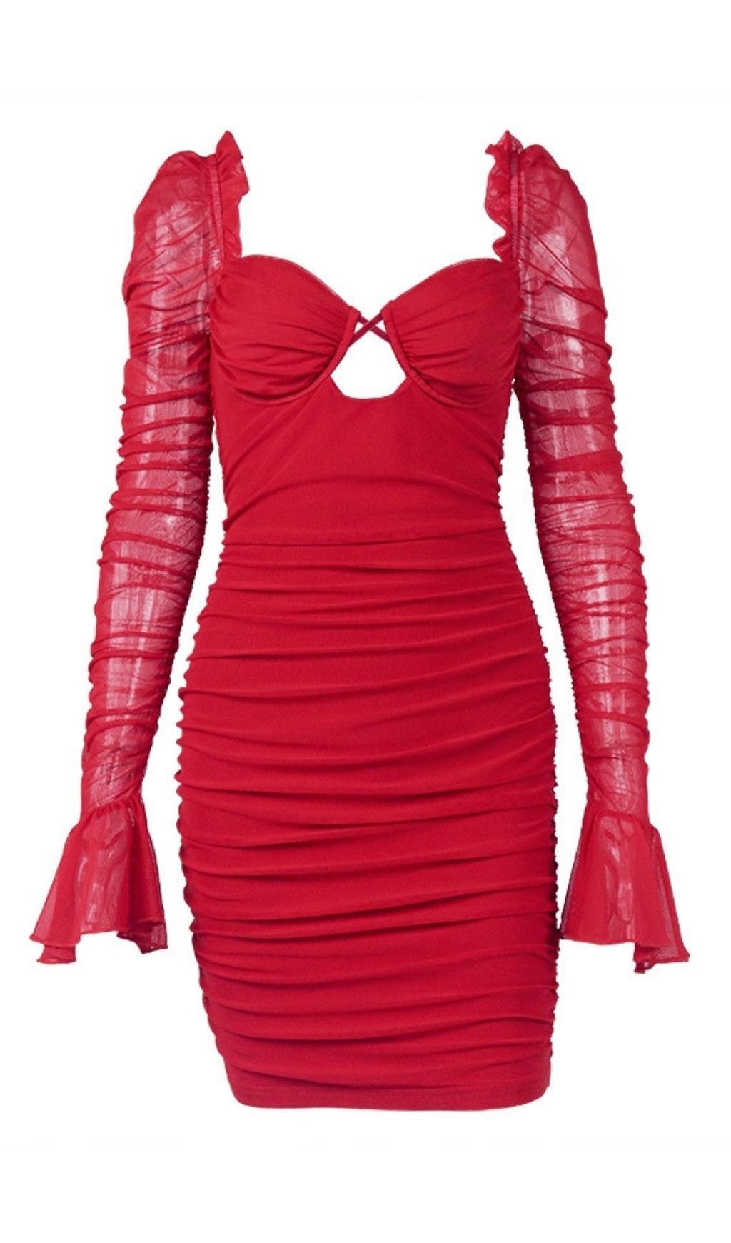 Experience the perfect blend of provocation and femininity with our Long Sleeve Bodycon Mini Dress. Designed with a romantic ruffle along the neckline and adorned under the bust, this dress is sure to make you feel like the epitome of elegance. The draping detail on the open back adds an extra touch of charm, making it the prettiest dress you'll ever own.