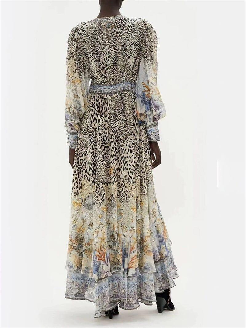 LONG SLEEVE DEEP V-NECK LEOPARD PATTERN WRAPPED WAIST MAXI DRESS