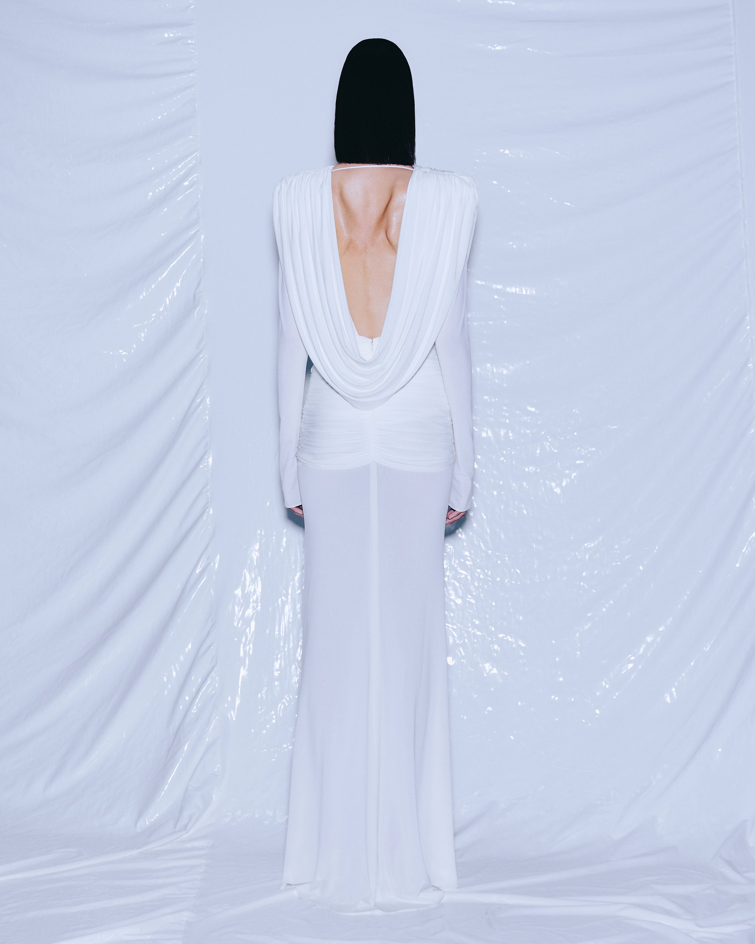 This long sleeve draped cowl neck maxi dress in white is a versatile and elegant addition to your wardrobe. With its flowy silhouette and draped neckline, it provides a flattering and comfortable fit. The long sleeves make it perfect for cooler weather, while the white color adds a touch of sophistication to any outfit.