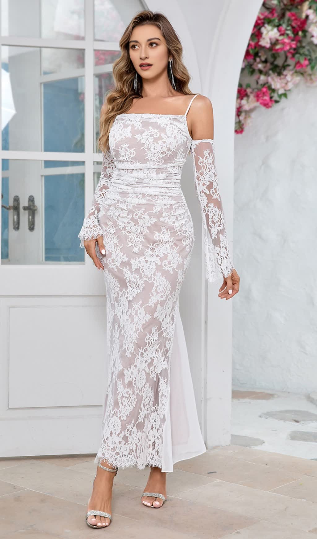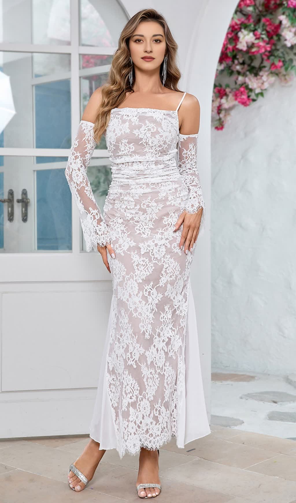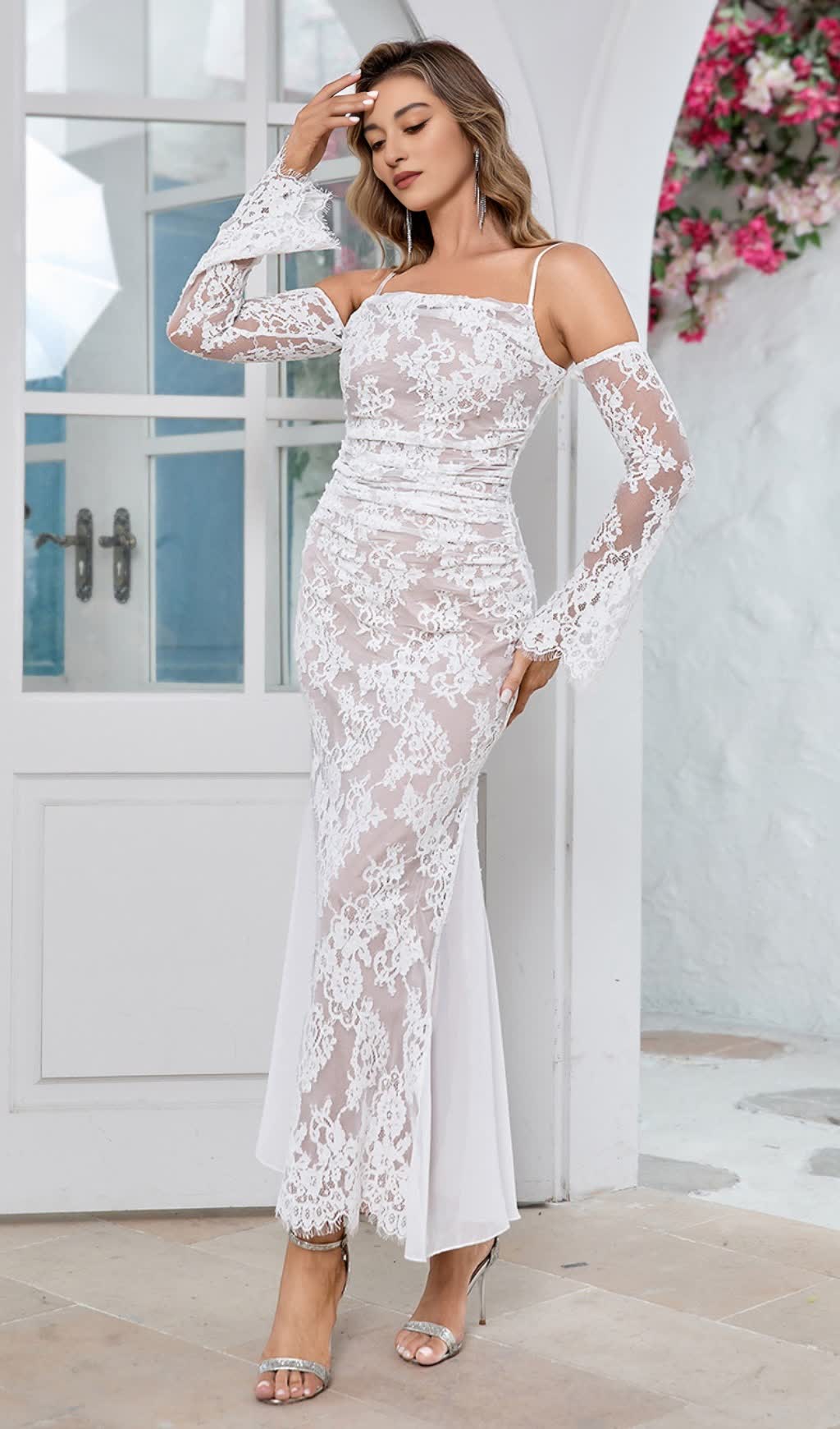 LONG SLEEVE DRAPED LACE MAXI DRESS IN WHITE