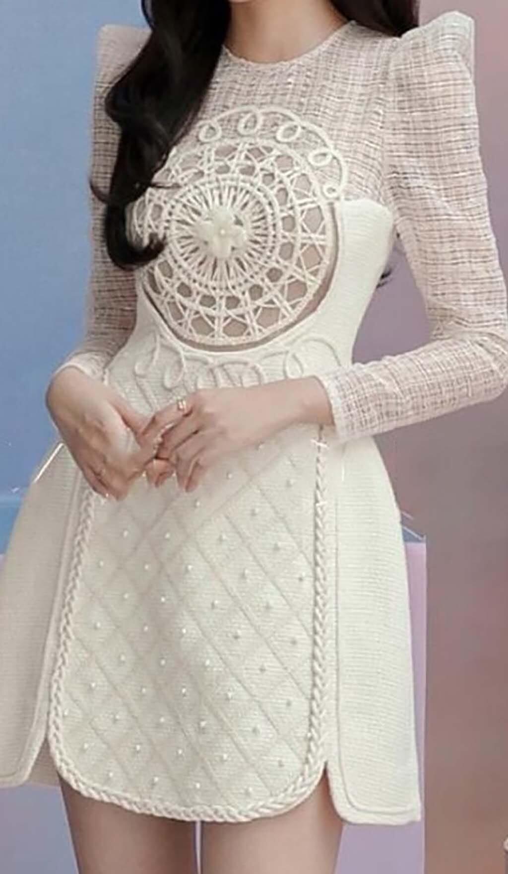 Introducing the Long-Sleeve Embroidered Lace Mini Dress in Beige