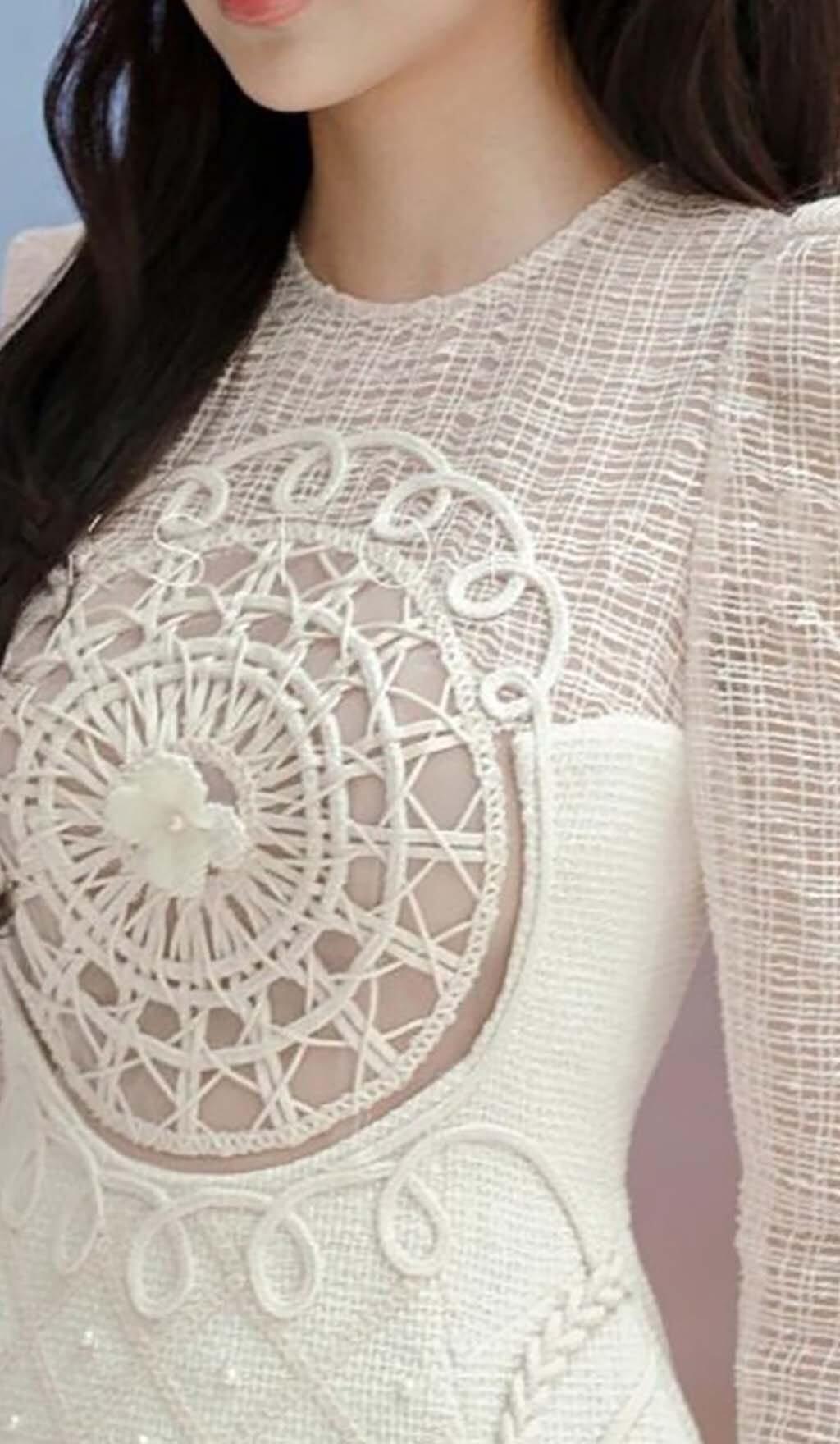 LONG-SLEEVE EMBROIDERED LACE MINI DRESS IN BEIGE