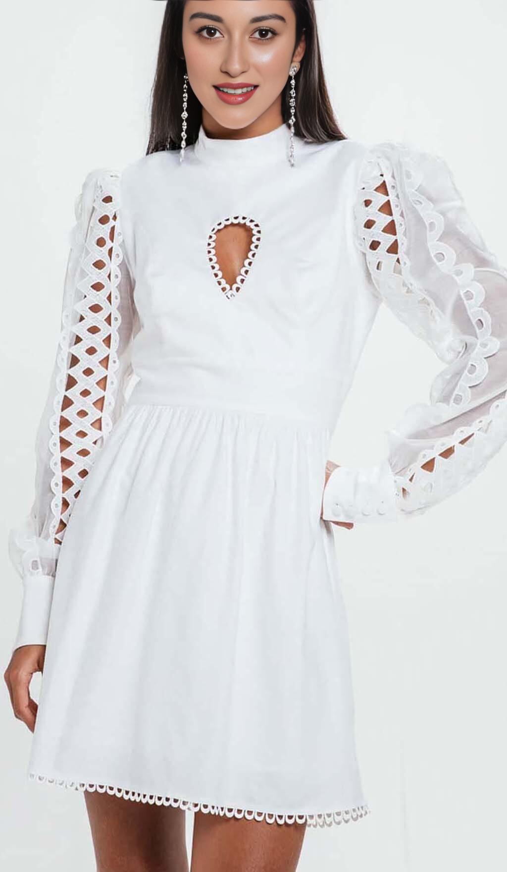 LONG SLEEVE EYELET EMBELLISHMENT MINI DRESS IN WHITE