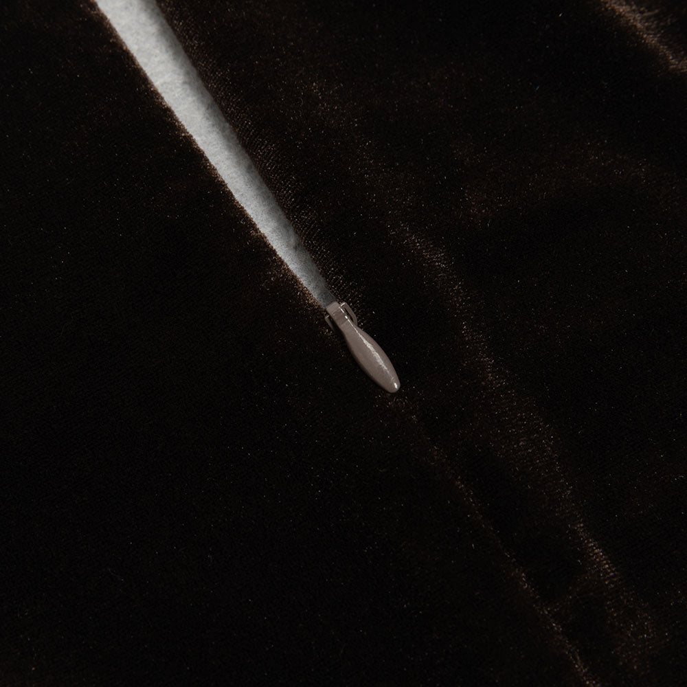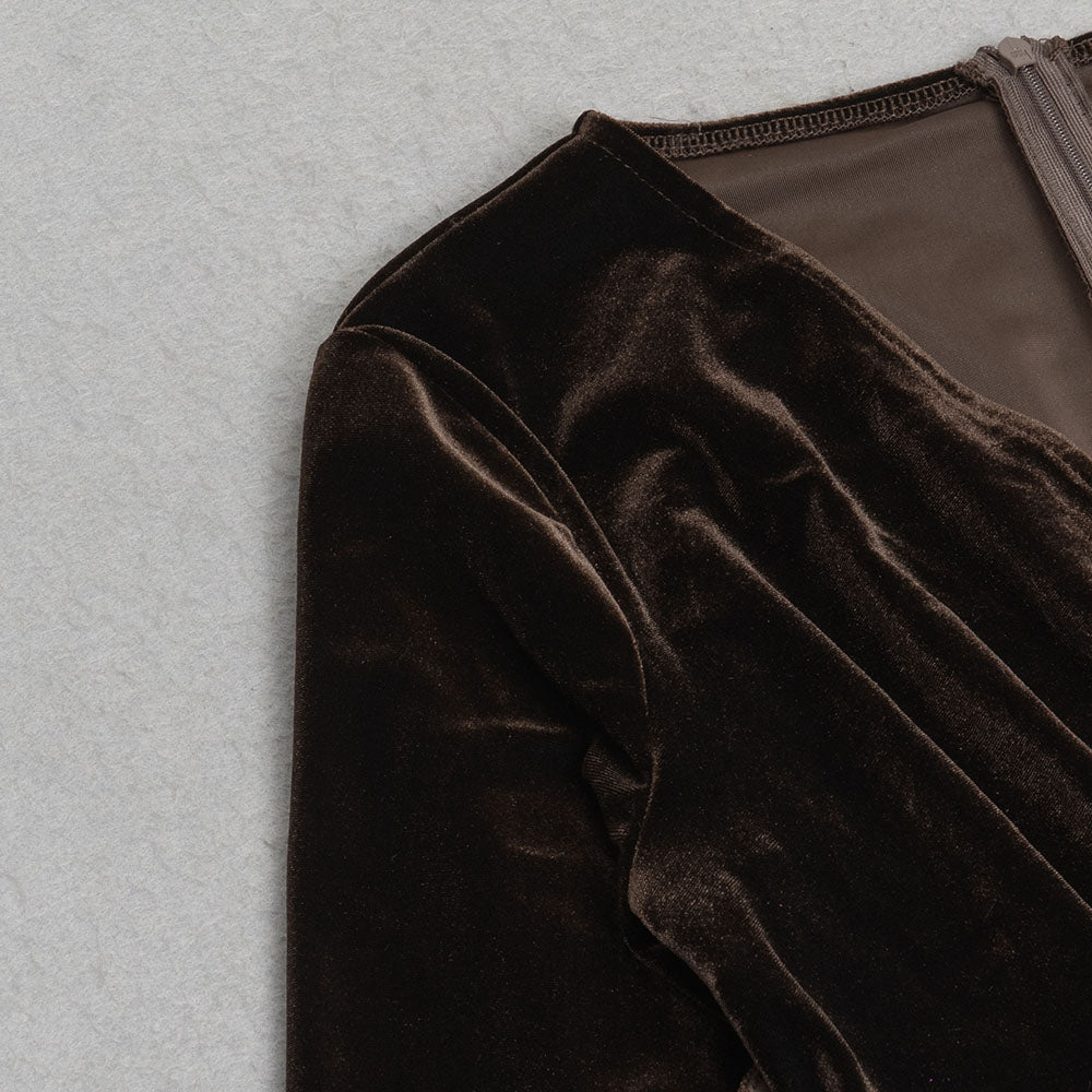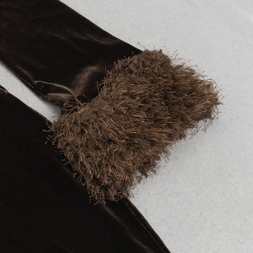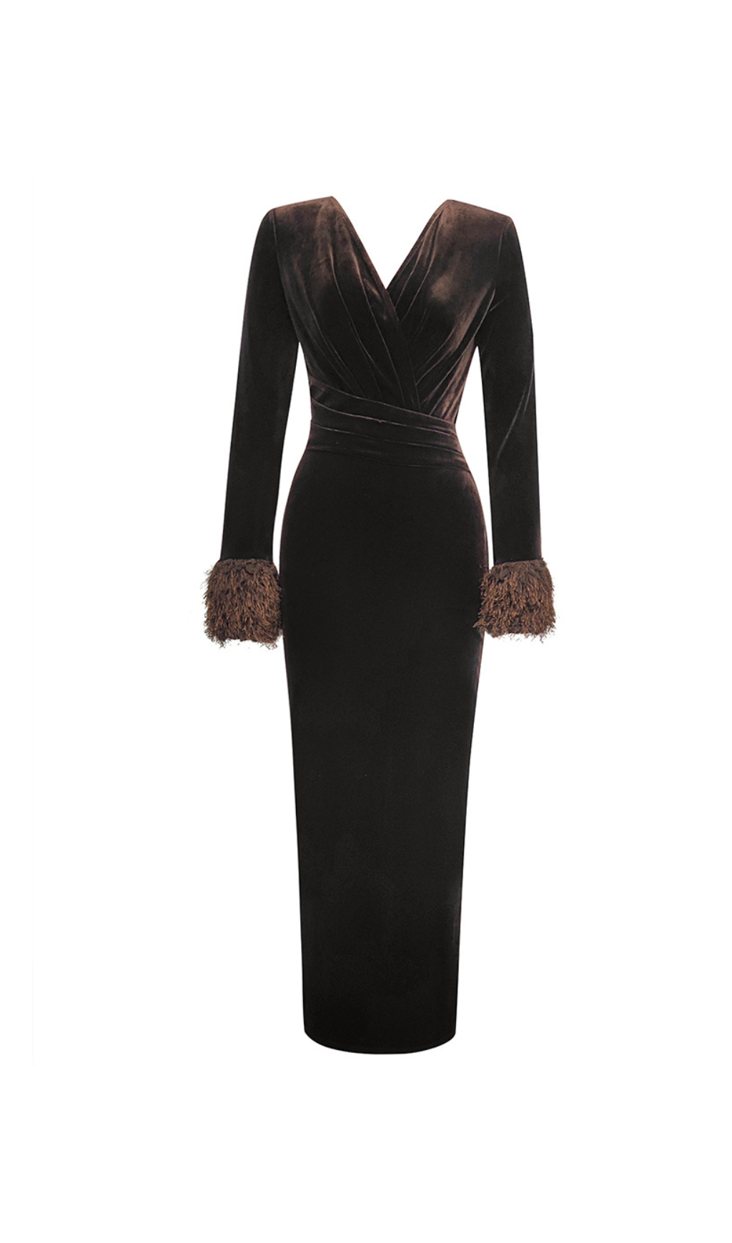 LONG SLEEVE FEATHER MAXI VELVET DRESS IN BROWN
