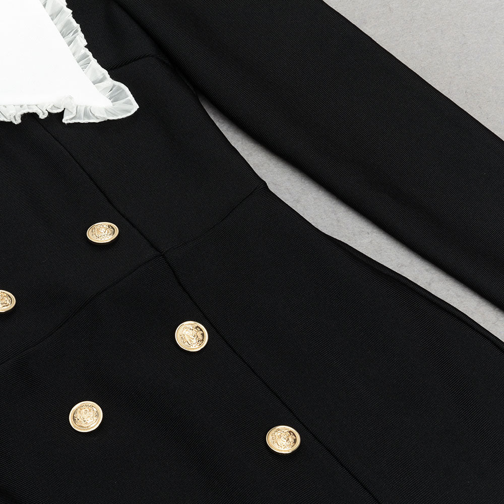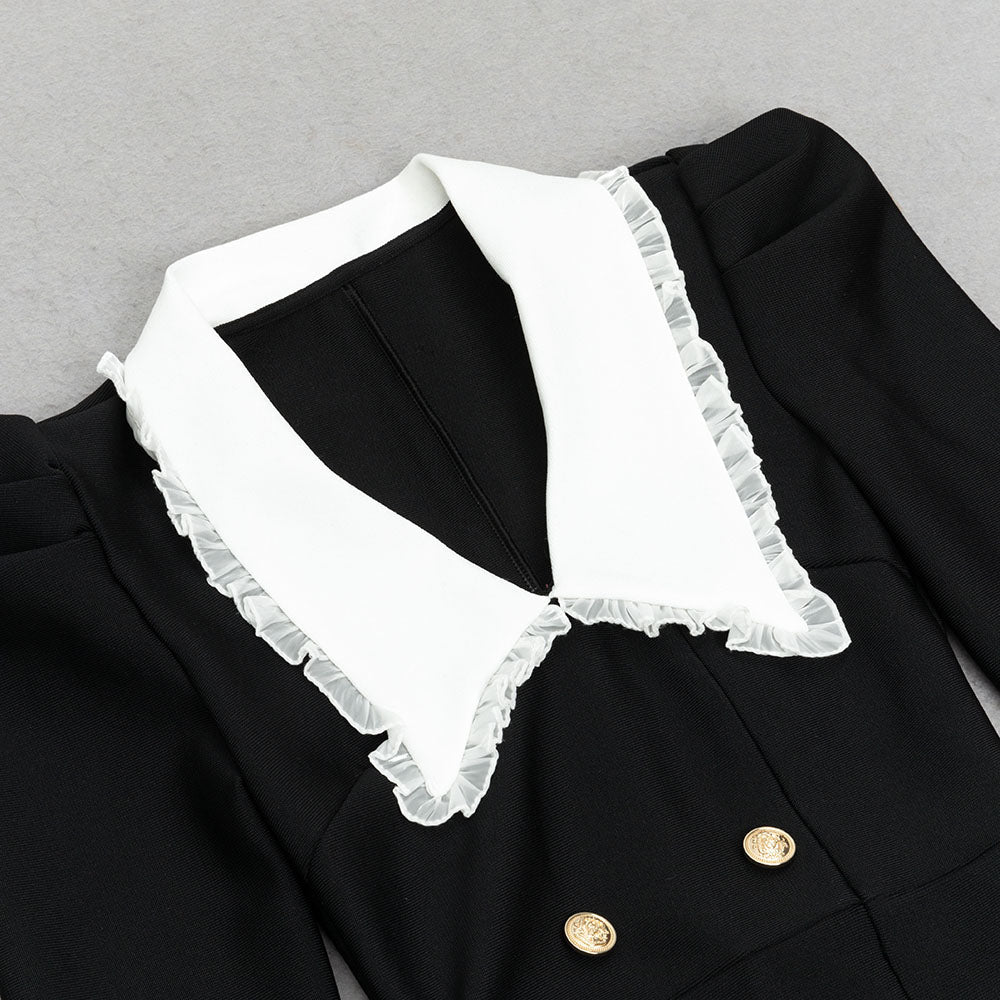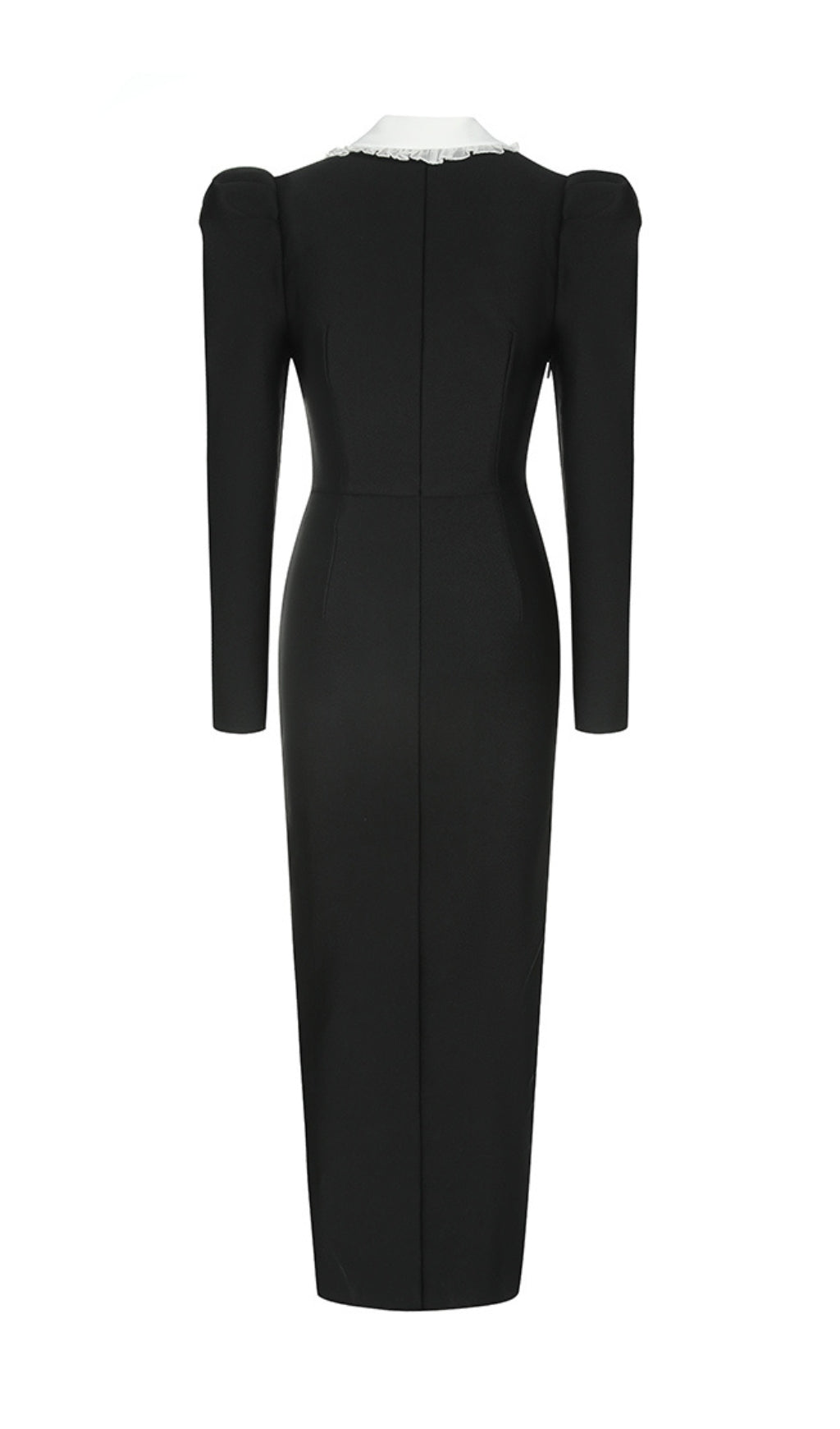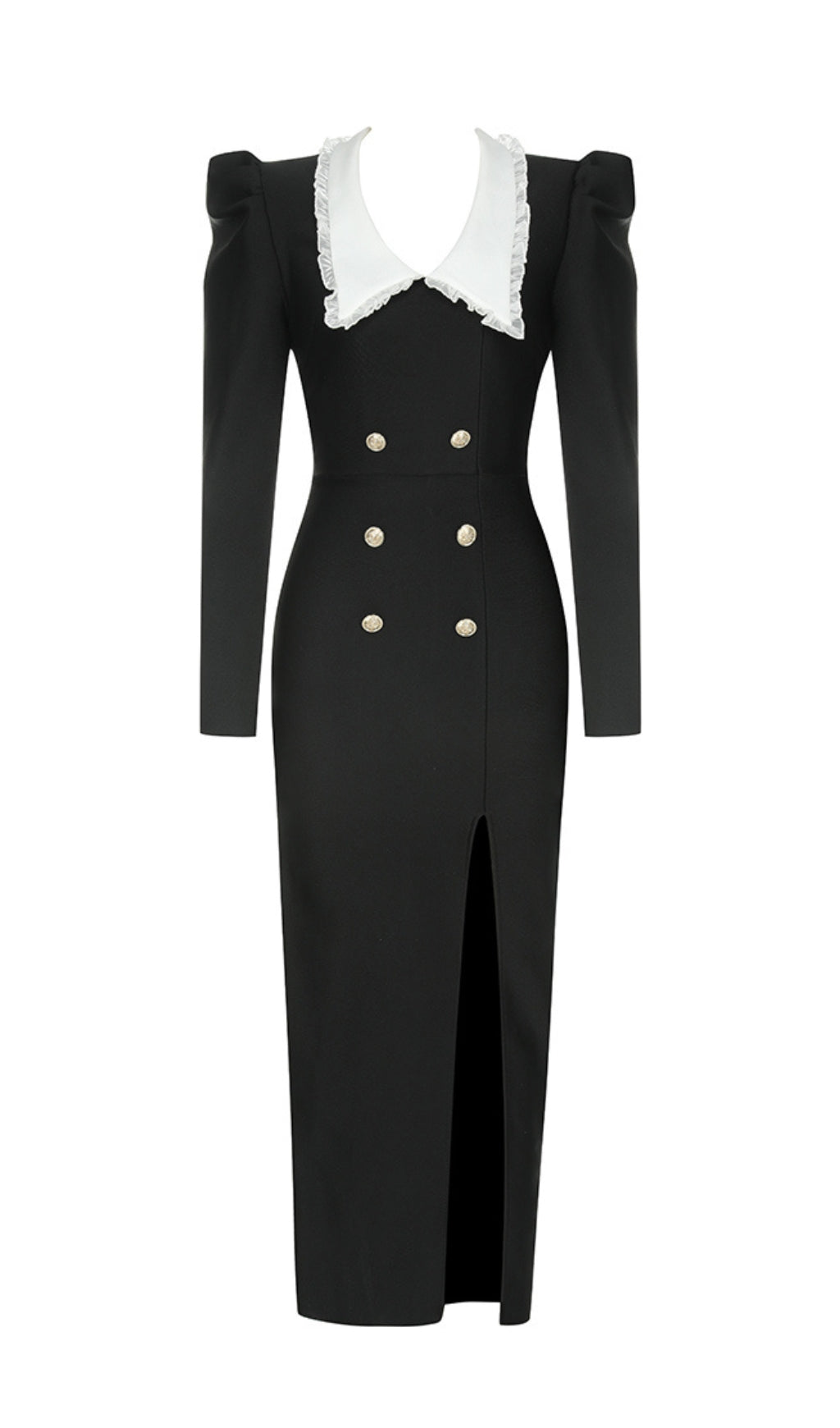 This exquisite dress features a delicate lace collar and long sleeves, adding a touch of elegance to the classic maxi silhouette. Perfect for a special occasion or a night out on the town. Make a statement in this exclusive, sophisticated piece.