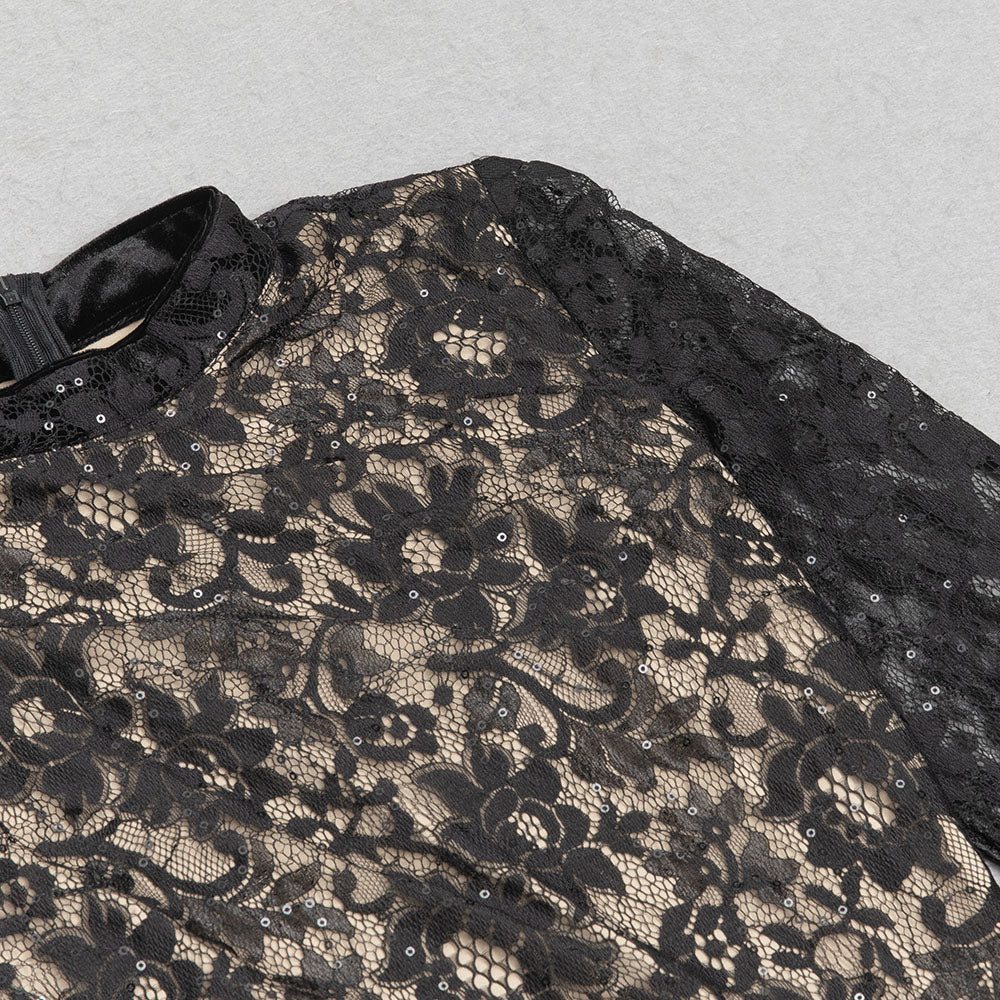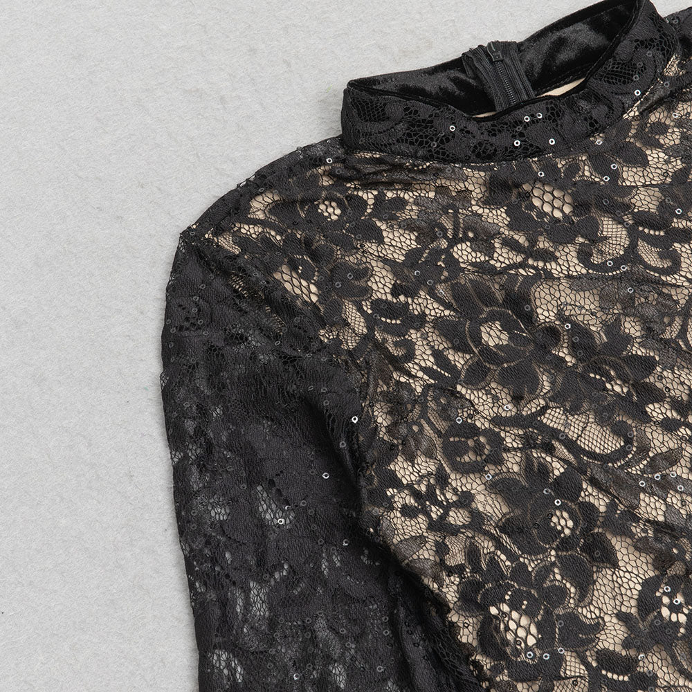 LONG SLEEVE SEQUIN LACE DRAPED MAXI VELVET DRESS IN BLACK