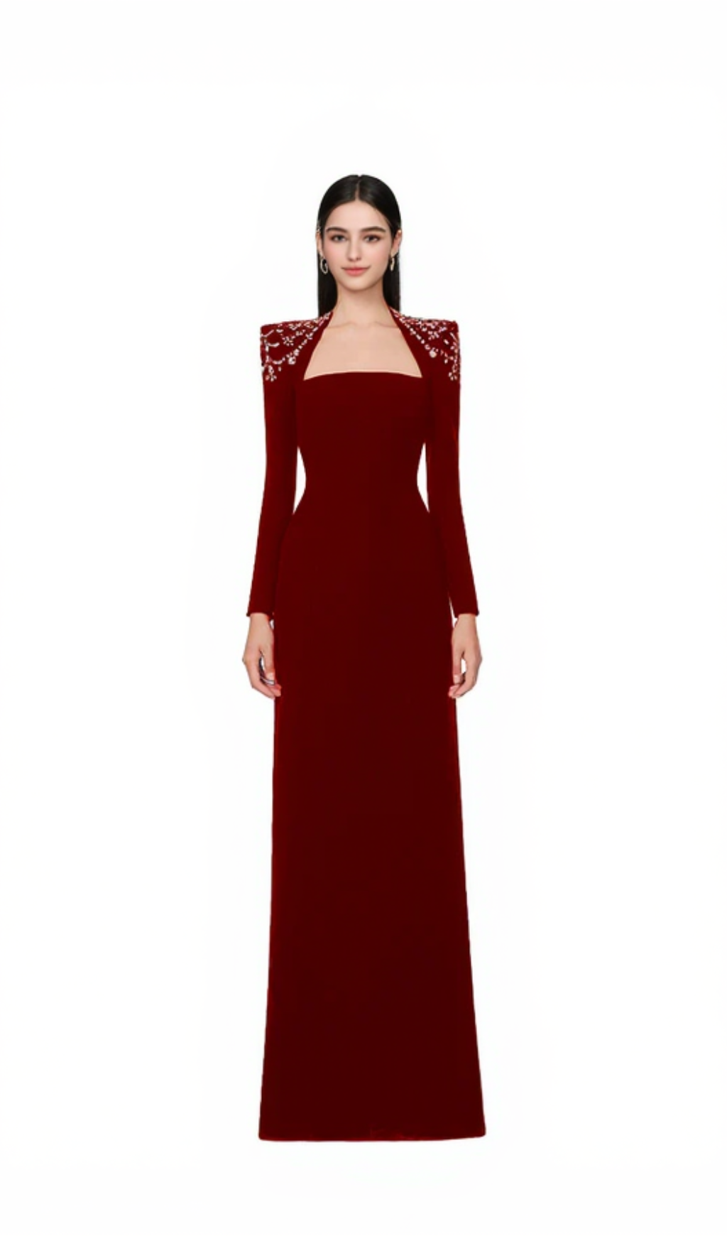 Luxury and handmade in Vietnam, this dress features a floor-length bodycon design with a unique trapezoid neckline and stunning shoulder stone embellishment.