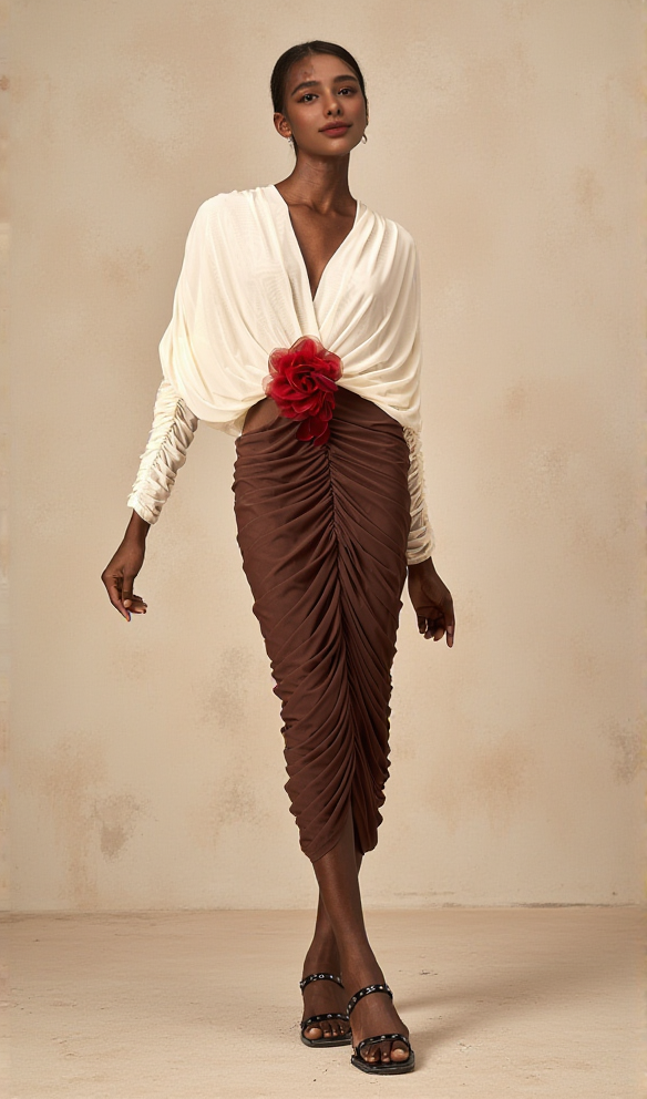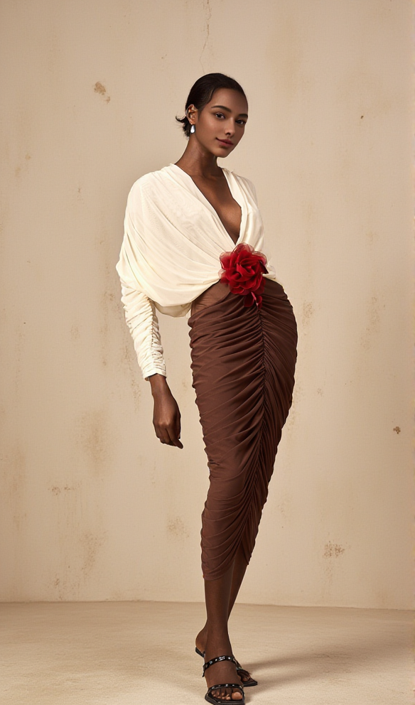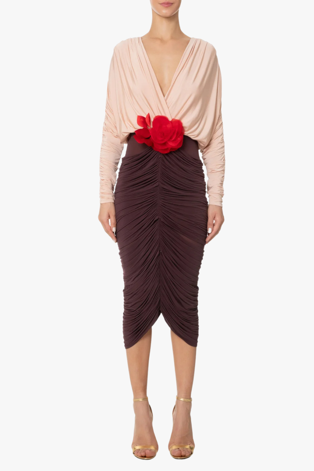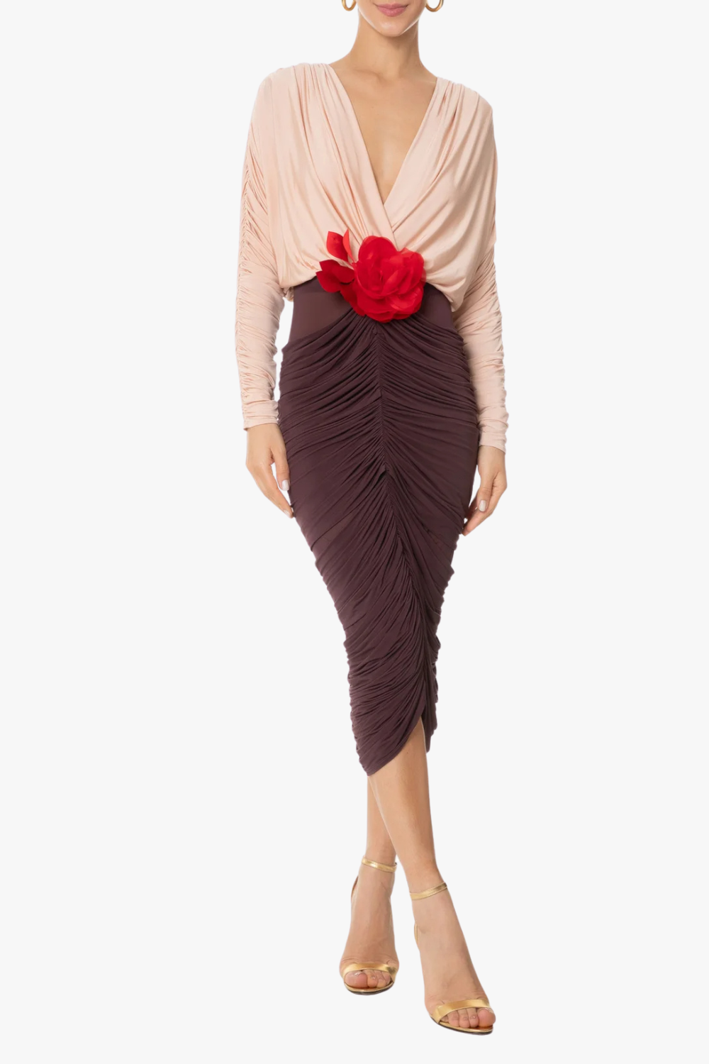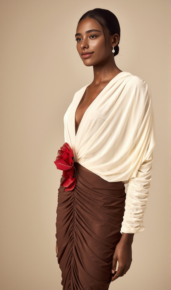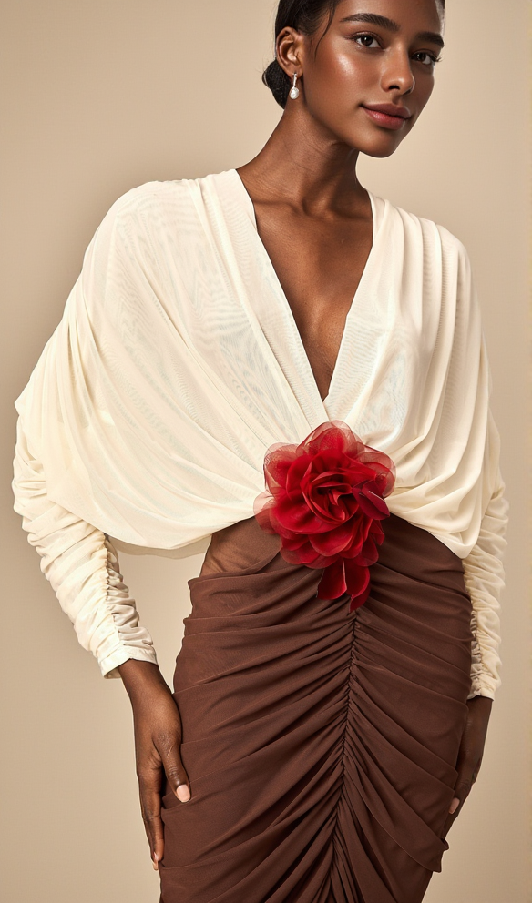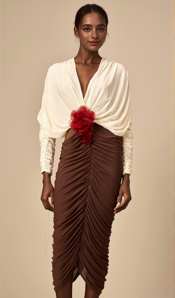 Long Sleeve Two-Tone pleated Midi Dress in Brown