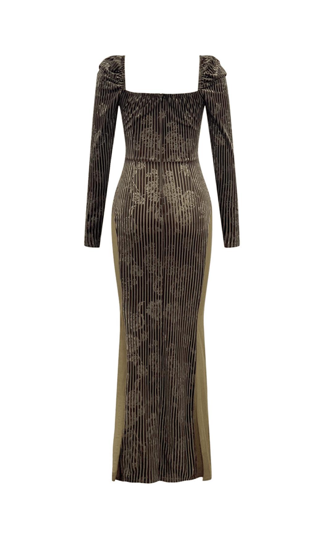 LOW-CUT SQUARE NECK LONG-SLEEVED PLEATED PRINTED LACE MAXI DRESS
