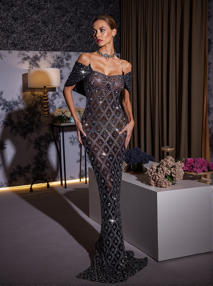 Lucca Rhinestone Mesh Maxi Dress