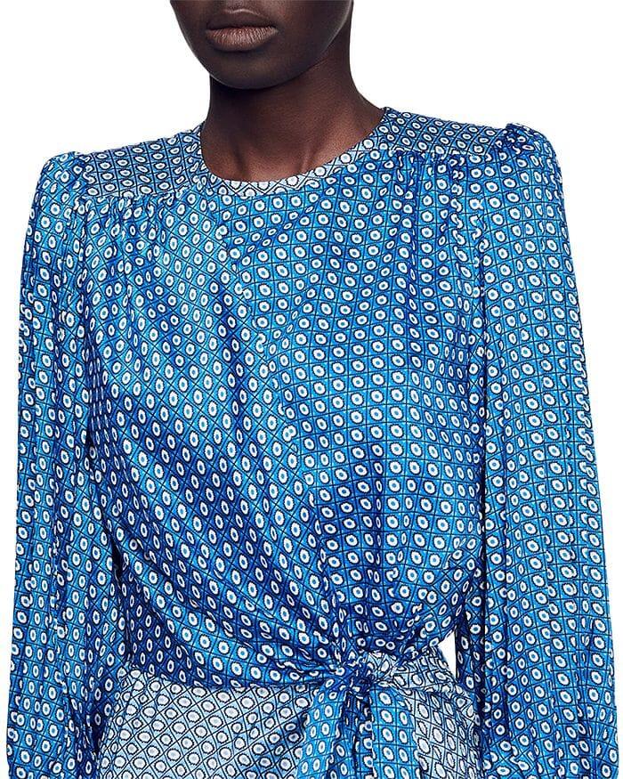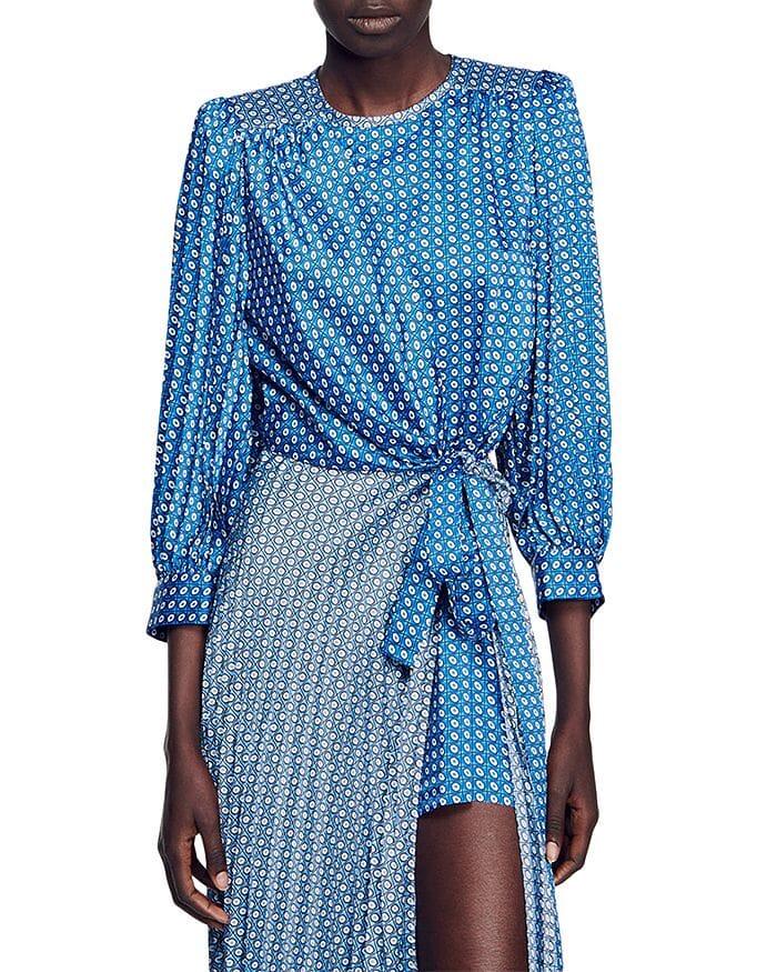 • Pleated satin, asymmetrical panel skirt with underskirt shorts, allover tie print