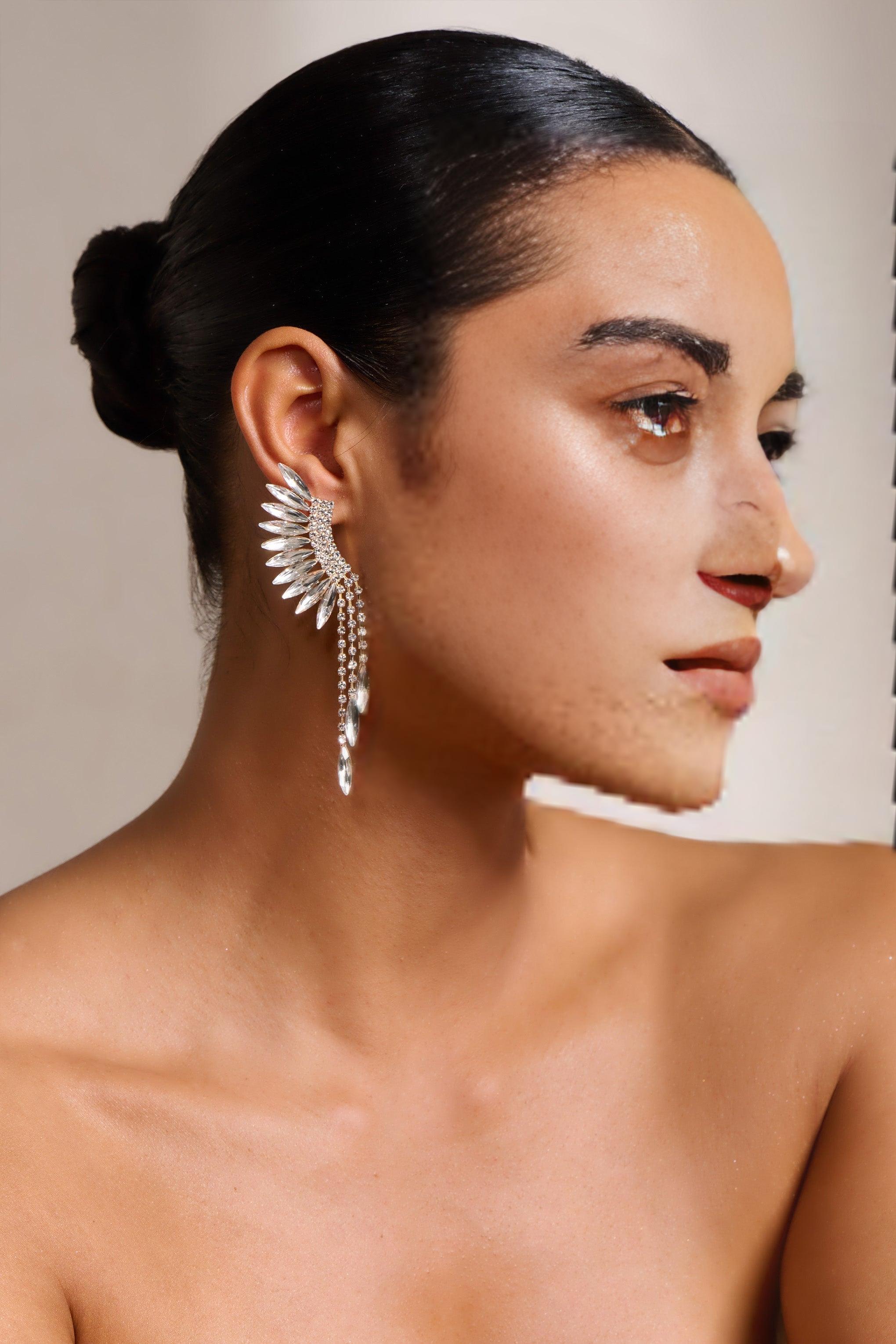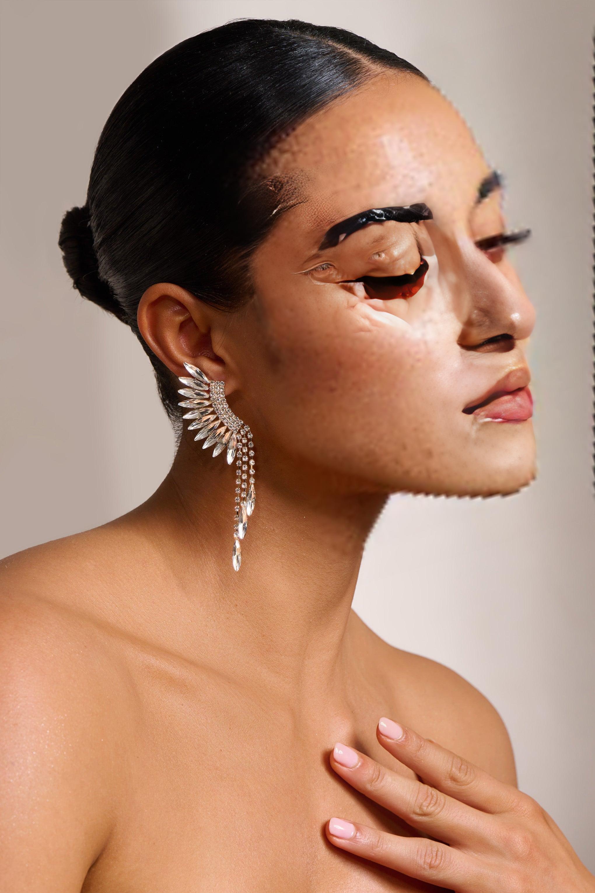Our earrings are designed to make a statement. The feathered shape adds a touch of whimsy and the crystal embellishments add a touch of elegance, making these earrings perfect for both formal occasions and everyday wear.