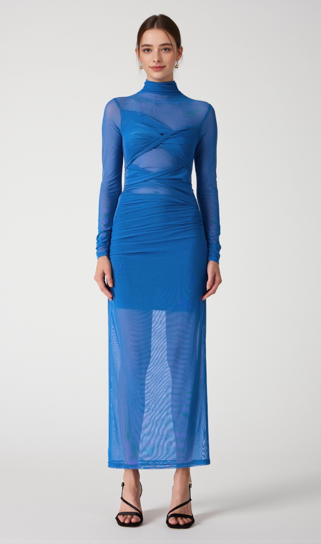Crafted from our signature sheer mesh, this dress features a high neckline and long sleeves for a refined look and a twist detail across the body for added texture.