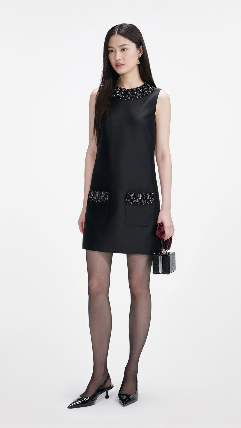 Clean lines meet party-ready shine in the shift silhouette of this LBD, which unites the soft sheen of taffeta with oversized diamanté trims. Add our statement jewellery for a night to remember.