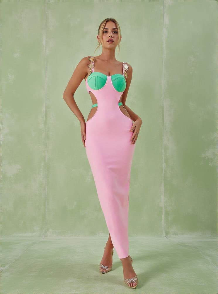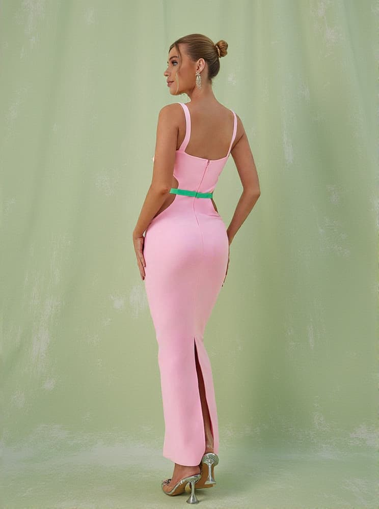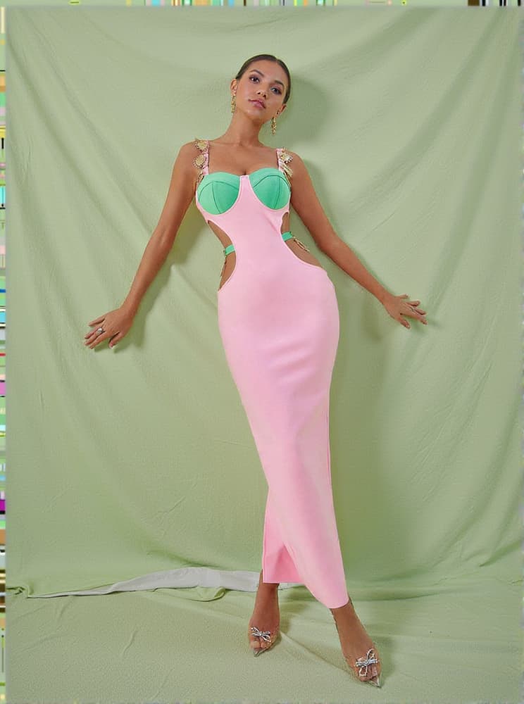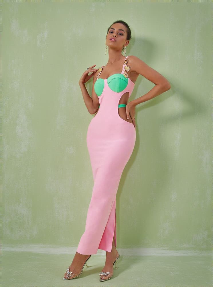 Get ready to look all kinds of glam in this Margaux Embellished Cutout Maxi Dress In Pink. Featuring a pink and green material with a cut out design and metal embellished detailing. Wear with clear heels and simple accessories to steal all the stares.