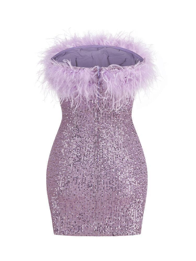 Stand out in our Marin Strapless Feather Sequin Mini Dress In Violet. This showstopping sequin mini dress features a strapless neckline and flirty feather trim at the top. Style this sparkly dress with black heels for a sophisticated outfit perfect for a girl's night out.