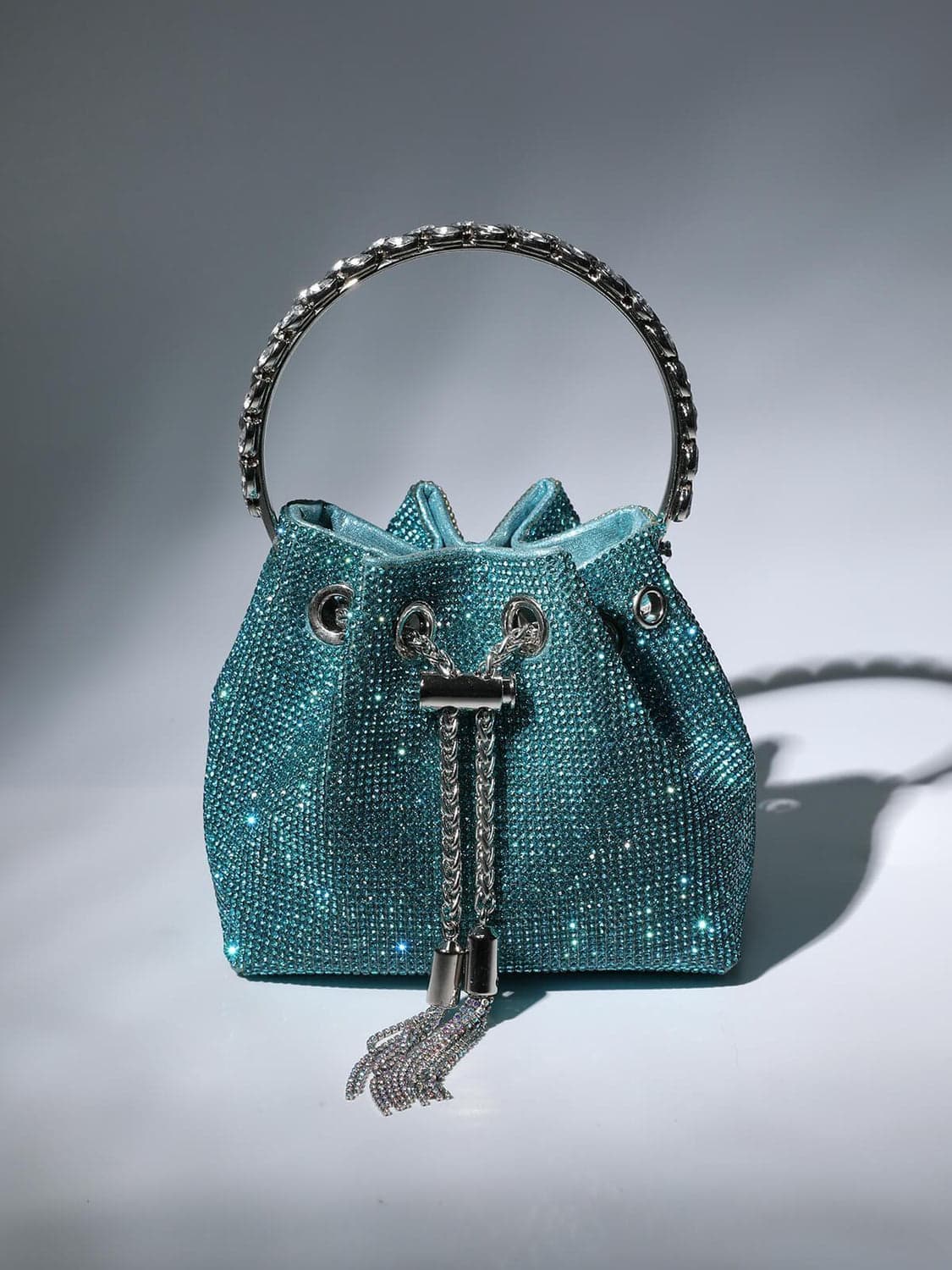 Our signature Mattea Crystal Embellished Bucket Bag In Blue is crafted from hot pink crystal. A statement accessory to love forever, it is finished with a sparkling crystal top handle and a sleek drawstring chain that cinches the supple shape. Take yours with you everywhere.