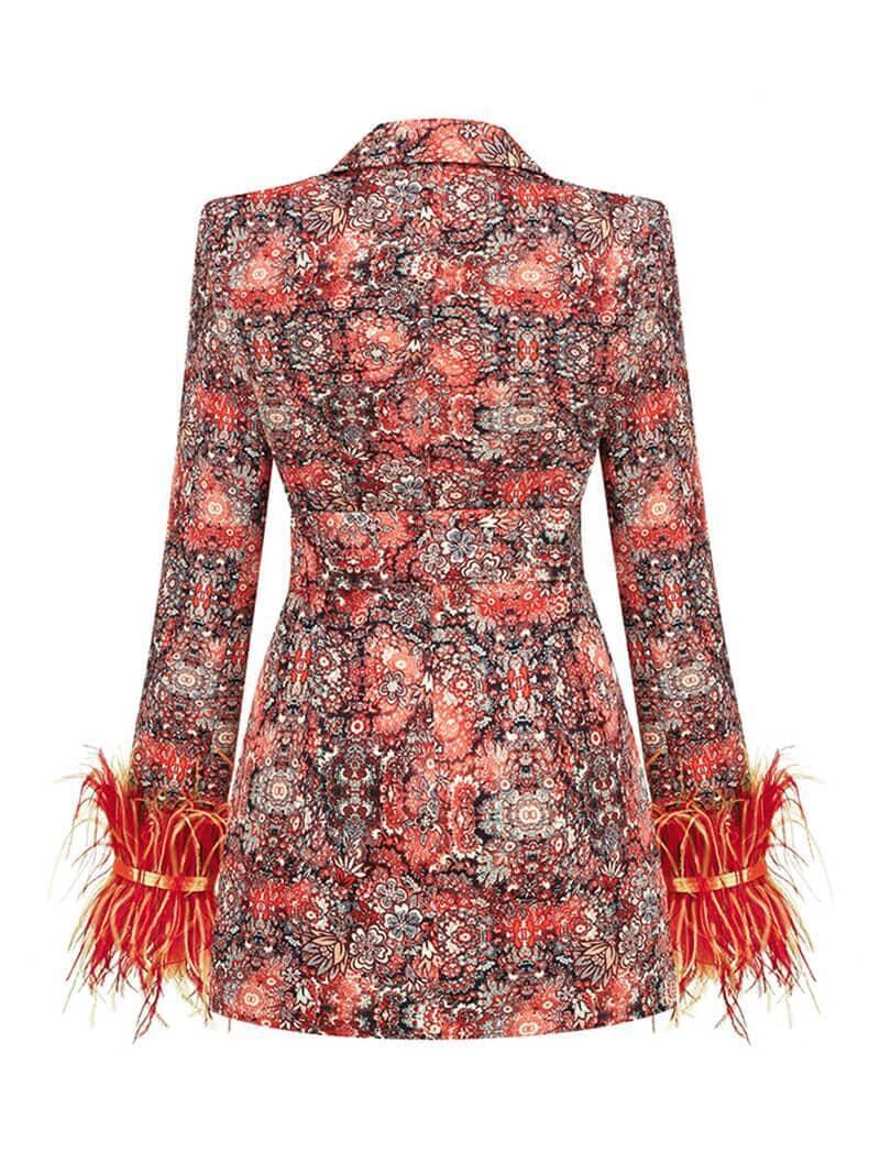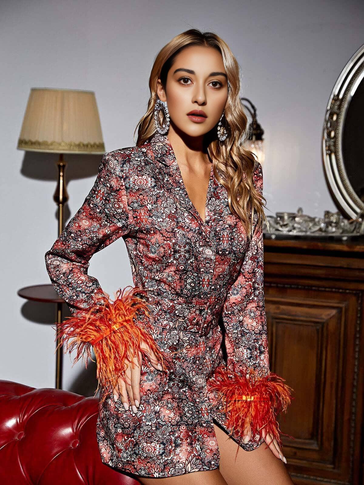 Have all eyes on you in this Long Sleeve Floral Blazer Dress. Featuring a high-quality material with a contrasting floral print, and a feather detailing. Style this with wrap around heels and a statement mini bag to complete the look.